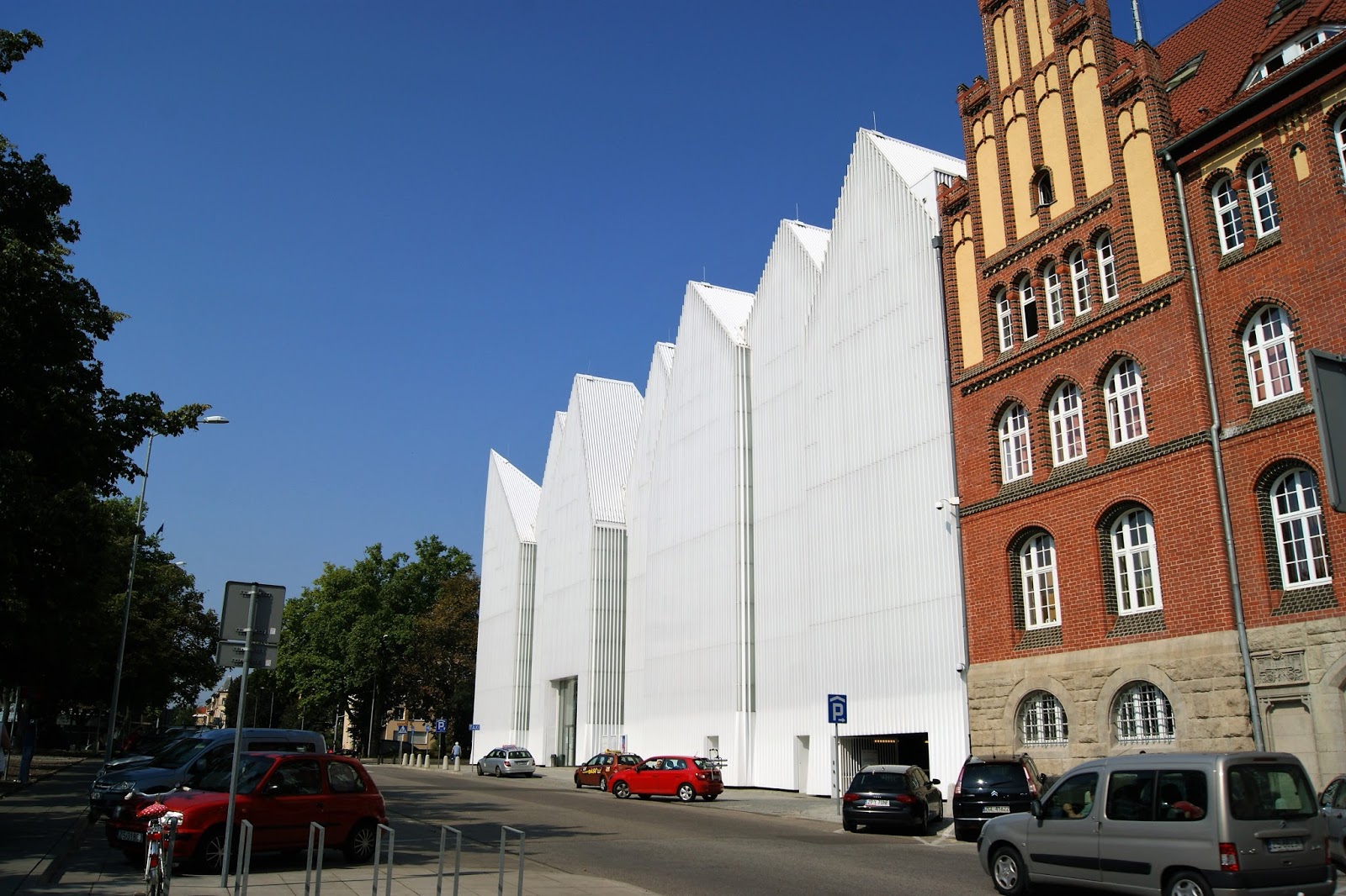 Niewątpliwie największą „gwiazdą” Placu Solidarności, jeżeli chodzi o architekturę, jest oddana do użytku w 2014 roku Filharmonia im. Mieczysława Karłowicza. Budynek zaprojektowany przez katalońskie Estudio Barozzi Veiga od dłuższego już czasu zdobywa najwyższe laury na międzynarodowych konkursach branżowych, powoli stając się nową wizytówką Szczecina i jednym z najbardziej rozpoznawalnych obiektów w Polsce. W zamyśle autorów gmach swoim kształtem ma przypominać wierzchołek góry lodowej. Czemu akurat taki pomysł? Nie wiemy i nigdzie nie znaleźliśmy odpowiedzi na to pytanie. W każdym razie nam już od pierwszego ujrzenia, kiedy jeszcze mogliśmy oglądać tą budowlę tylko w TV, bardziej kojarzyła się z białym zarysem kamieniczek o spadzistych dachach i tej koncepcji w dalszym ciągu będziemy się trzymać, gdyż jest ona bliższa naszemu sercu 🙂