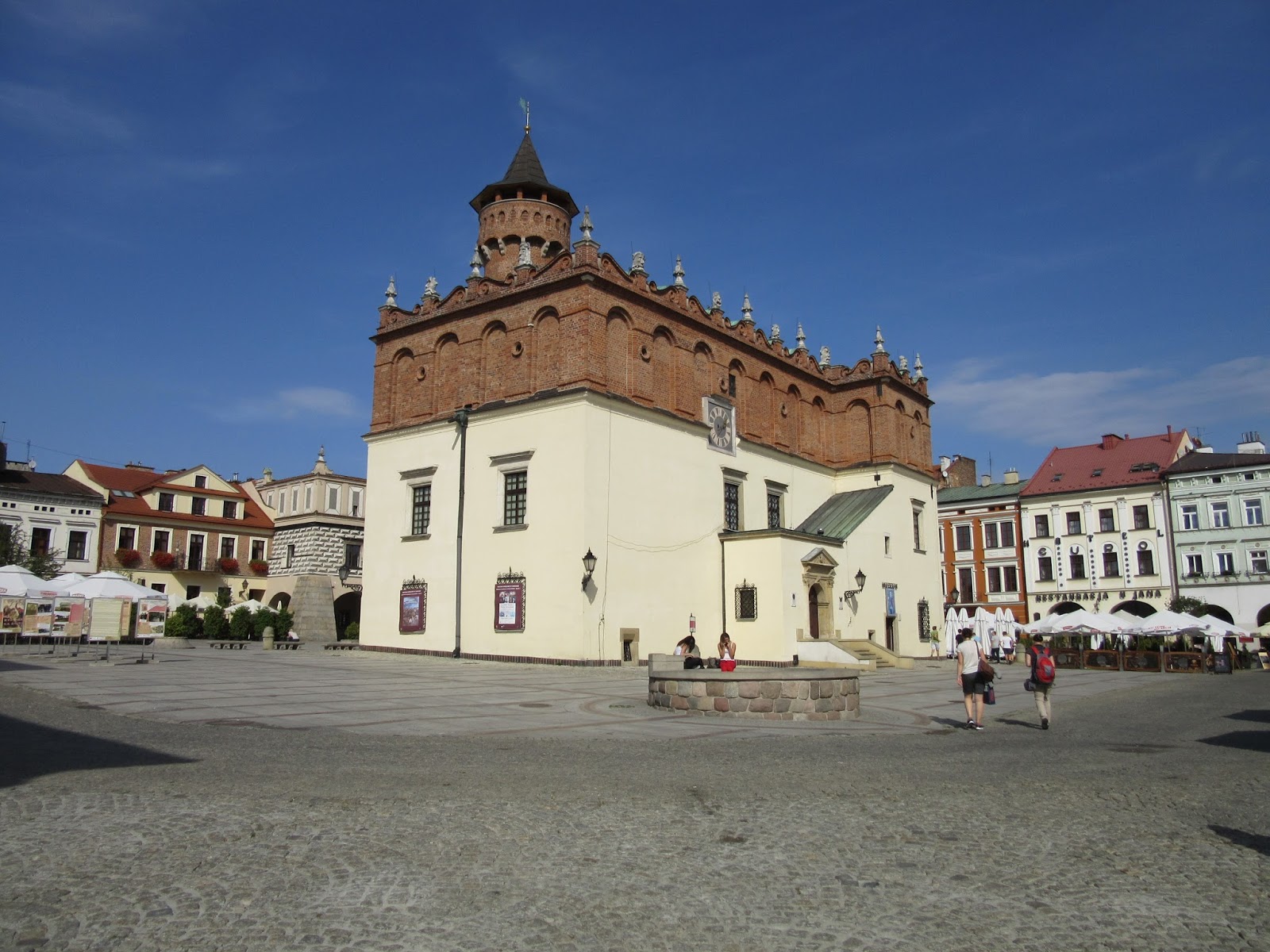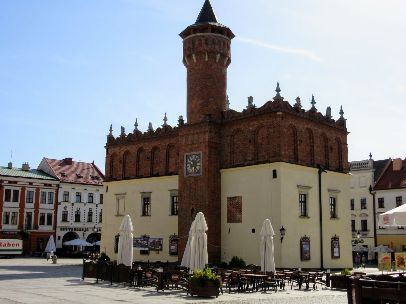 Tarnowski Rynek może i nie jest duży, ale za to ma swój urok i to coś, co pozwala zapamiętać go na długo. Jego największą ozdobą jest Ratusz, który powstał w XIV wieku. Przez stulecia istnienia był on wielokrotnie modernizowany i przebudowywany, aż osiągnął dzisiejszy renesansowy wygląd przywodzący na myśl włoskie miasta. Na Rynku, poza Ratuszem, możemy podziwiać ładne kamienice pochodzące z okresu XVI-XVIII wieku. Szczególną uwagę przykuwają tutaj budynki znajdujące się pod numerami 20 i 21, które wyróżniają sie na tle pozostałych swoimi zdobieniami, ale przede wszystkim podcieniami. Siedzibę w nich ma Muzeum Okręgowe. My z kolei, nasze pierwsze kroki skierowaliśmy do budynku znajdującego się pod numerem 7. Mieści się w nim Centrum Informacji Turystycznej, w którym można bezpłatnie otrzymać wiele broszurek z propozycjami najciekawszych tras spacerowych oraz plan miasta. Trzeba tu wyraźnie powiedzieć, że Tarnów jest doskonale przygotowany na przyjęcie turystów i umie chwalić sie tym co ma najcenniejsze. Nie zapomina również o dzieciach. Z myślą o nich został wytyczony szlak o nazwie „Tarnów dla najmłodszych”, którego opis można odnaleźć na osobnej ulotce. W Centrum Informacji Turystycznej możemy również zakupić słynną herbatę „Tarninówkę” będącą jednym z najbardziej rozpoznawalnych, tutejszych produktów, a także co ważne dla matek z małymi dziećmi, skorzystać za darmo z przewijaka. O klucz trzeba poprosić, którąś z miłych pań pracujących w tym miejscu.