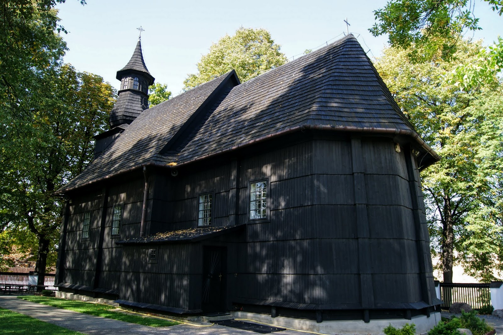 Wychodząc z drugiej strony głównej alei cmentarza znajdujemy się około 150 metrów od drugiego drewnianego kościoła w Tarnowie. Tym razem mowa o świątyni pod wezwaniem Trójcy Przenajświętszej, zwanej również Kościołem „Na Terlikówce”. Pochodzi on z drugiej połowy XIV wieku. Jego wnętrze zupełnie różni się od tego „Na Burku”. Jego ściany są pomalowane na biało, co świetnie się komponuje z niebieskim stropem ozdobionym polichromią. Godne uwagi są również obrazy zdobiące boczne ściany. Część z nich pochodzi już z XVI wieku. Dojście do kościoła po wyjściu z cmentarza niestety nie jest dobrze oznaczone. My pytaliśmy się miejscowych jak tam trafić. Okazało się, że droga jest banalnie prosta. Należy po opuszczeniu nekropolii skręcić w prawo w ulicę Ziaji, a następnie przejść tunelem pod nasypem kolejowym, skąd kościółek jest już widoczny.