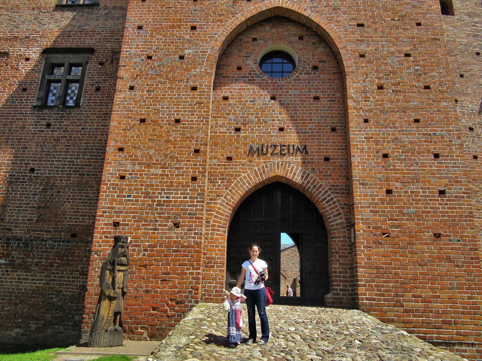 Z Łęczyckiej Zagrody Chłopskiej wyjeżdżaliśmy z niemałym żalem, że tak szybko zleciał nam czas. Człowiek najchętniej posiedziałby trochę dłużej na ławeczce przed którąś z chałup popijając na przykład kwaśne mleko lub babciny kompot z jabłek i pokontemplował te wszystkie sielankowe krajobrazy, których na co dzień w dużym mieście, takim jak Wrocław, próżno ze świecą szukać. Niestety kolejne minuty płynęły nieubłaganie, a przed nami była przecież wizyta w samej Łęczycy. W końcu po to tu właściwie przyjechaliśmy 🙂 Ruszyliśmy zatem dalej ogromnie ciekawi tego, czym jeszcze zaskoczy nas ten niezwykle piękny skrawek Polski na pograniczu województw łódzkiego i kujawsko-pomorskiego. Nasz pierwszy cel w mieście: zamek królewski postawiony, a jakże, przez samego Kazimierza Wielkiego najprawdopodobniej w latach 1357-1365. Dotarliśmy do niego zaledwie kilka minut po opuszczeniu skansenu i, co ciekawe, chyba więcej czasu zajęło nam zapinanie Madzi w foteliku niż sama jazda. Zaparkowaliśmy Stilusia na bezpłatnym parkingu tuż pod ceglanymi murami i już chwilę później zameldowaliśmy się przed okazałą bramą budowli, w której obecnie mieści się muzeum.