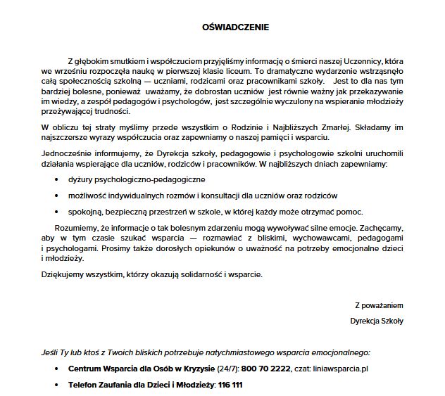 Szkoła, do której uczęszczała Victoria, nie komentuje tragicznego wydarzenia. – Wszyscy, którzy tego potrzebowali, zostali objęci pomocą – mówi Zbigniew Klipow z centrali TEB Edukacja. Liceum w swoich mediach społecznościowych zamieściło wpis: Z ogromnym smutkiem przyjęliśmy wiadomość o tragicznej śmierci naszej uczennicy. Odeszła zbyt wcześnie, pozostawiając pustkę, której nie da się wypełnić… W tym bolesnym czasie łączymy się w żałobie z Rodziną i Przyjaciółmi.