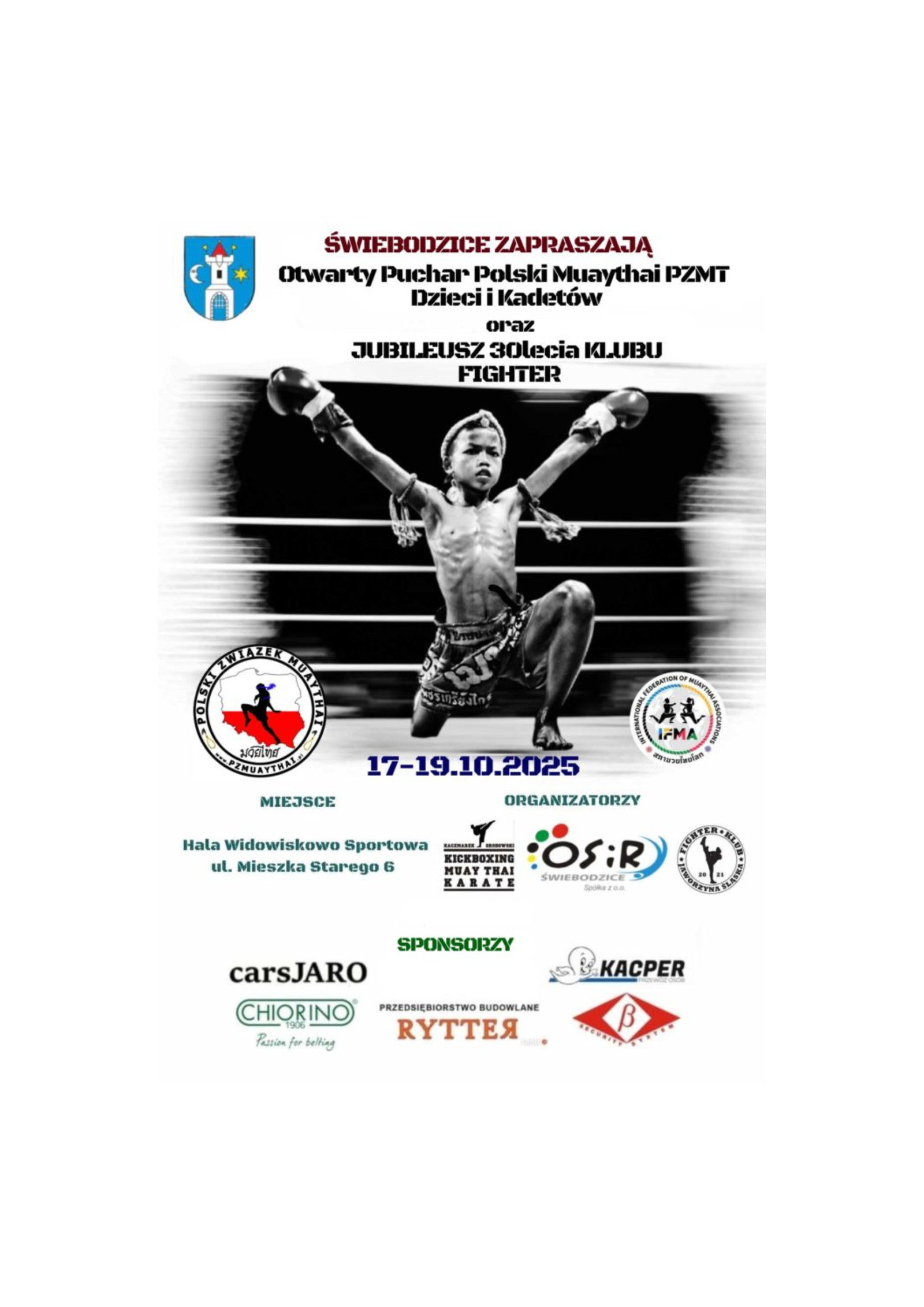 W piątek, 17 października w hali widowiskowo-sportowej OSiR w Świebodzicach rozpocznie się Otwarty Puchar Polski Muaythai PZMT dla dzieci i kadetów. Zawody będą również okazją do świętowania 30-lecia powstania klubu Fighter Kaczmarek Grodowski. Na piątek przewidziano rejestracją zawodników i ich ważenie, a także odprawę trenerską. Na sobotę zaplanowano walki eliminacyjne i półfinały, natomiast wielki finał odbędzie się w niedzielę.