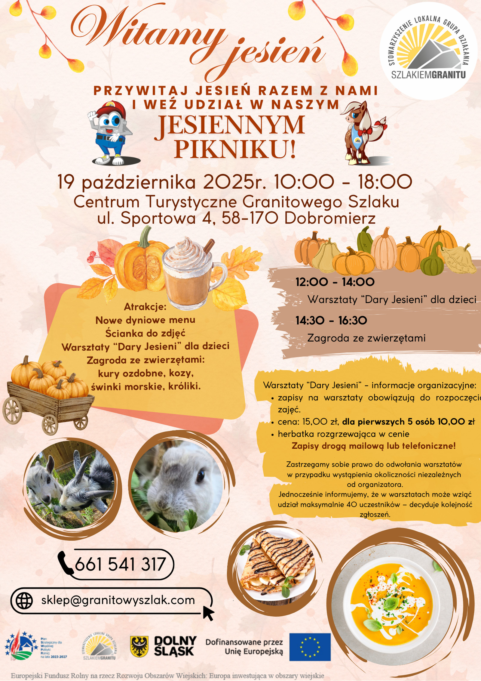 Stowarzyszenie Lokalna Grupa Działania „Szlakiem Granitu” zaprasza na jesienny piknik, który odbędzie się w najbliższą niedziele, 19 października w Dobromierzu. Data: 19 października 2025 r. (niedziela), godzina: 10:00 – 18:00, Miejsce: Centrum Turystyczne Granitowego Szlaku – Bistro&Sklep, ul. Sportowa 4, 58-170 Dobromierz. Więcej informacji: 661-541-317, [email protected]
