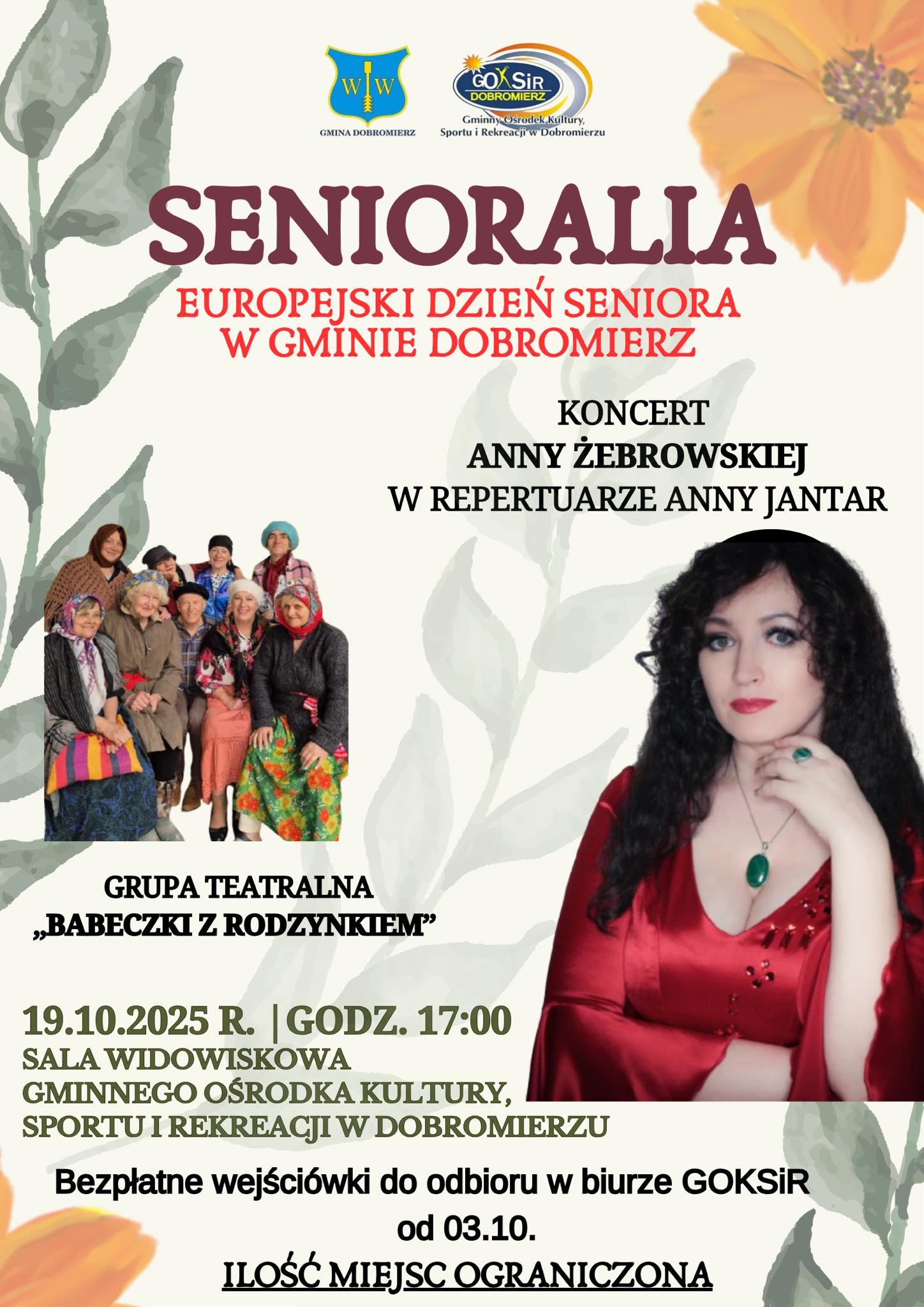 Już 19 października o godzinie 17.00 w sali widowiskowej Gminnego Ośrodka Kultury, Sportu i Rekreacji w Dobromierzu odbędą się Senioralia, czyli obchody Europejskiego Dnia Seniora w Gminie Dobromierz. Główną atrakcją wieczoru będzie koncert Anny Żebrowskiej, która wystąpi z repertuarem Anny Jantar, a całość wydarzenia uświetni występ grupy teatralnej „Babeczki z Rodzynkiem” z Bolkowa. Wstęp na wydarzenie jest bezpłatny, ale obowiązują wejściówki – do odebrania w biurze GOKSiR.