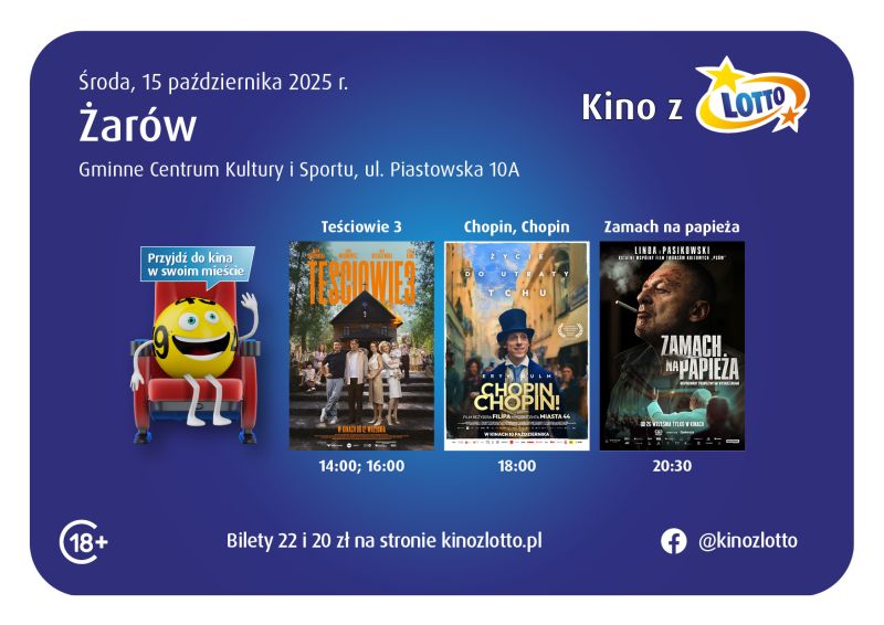 Kino z LOTTO ruszyło w trasę i do końca roku planuje odwiedzić aż 50 miejscowości. Dzięki temu ich mieszkańcy będą mogli poczuć wyjątkowe emocje przed wielkim ekranem i cieszyć się wspólnym oglądaniem premierowych hitów. To także okazja, by wziąć udział w akcji „Gdy grasz, wszystko gra!”, której celem jest tworzenie i ulepszanie lokalnych obiektów sportowych i kulturalnych. Do Żarowa kino objazdowe zawita już w środę, 15 października! Co w repertuarze?