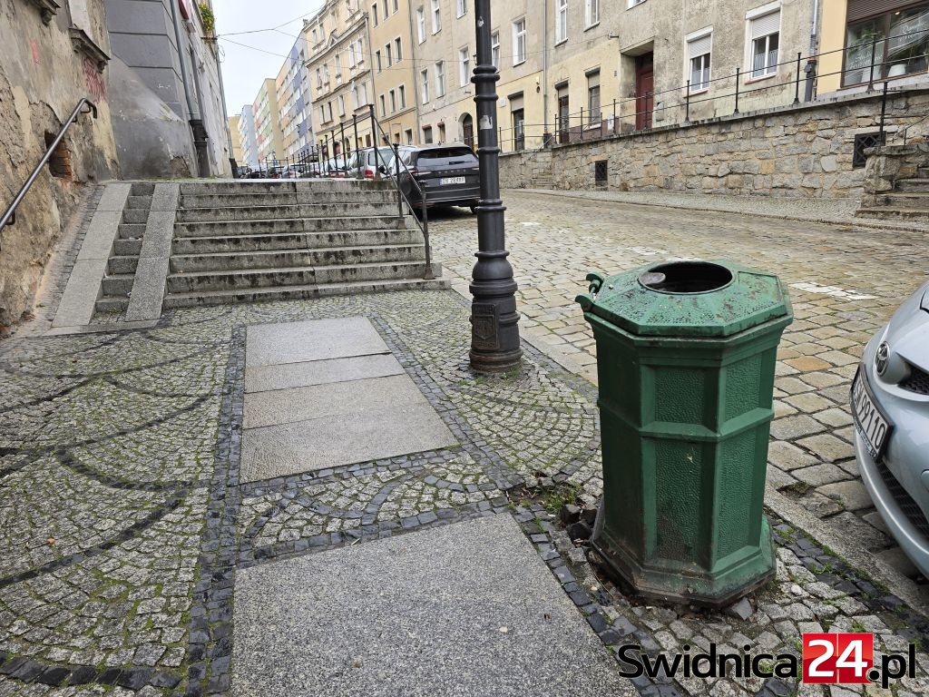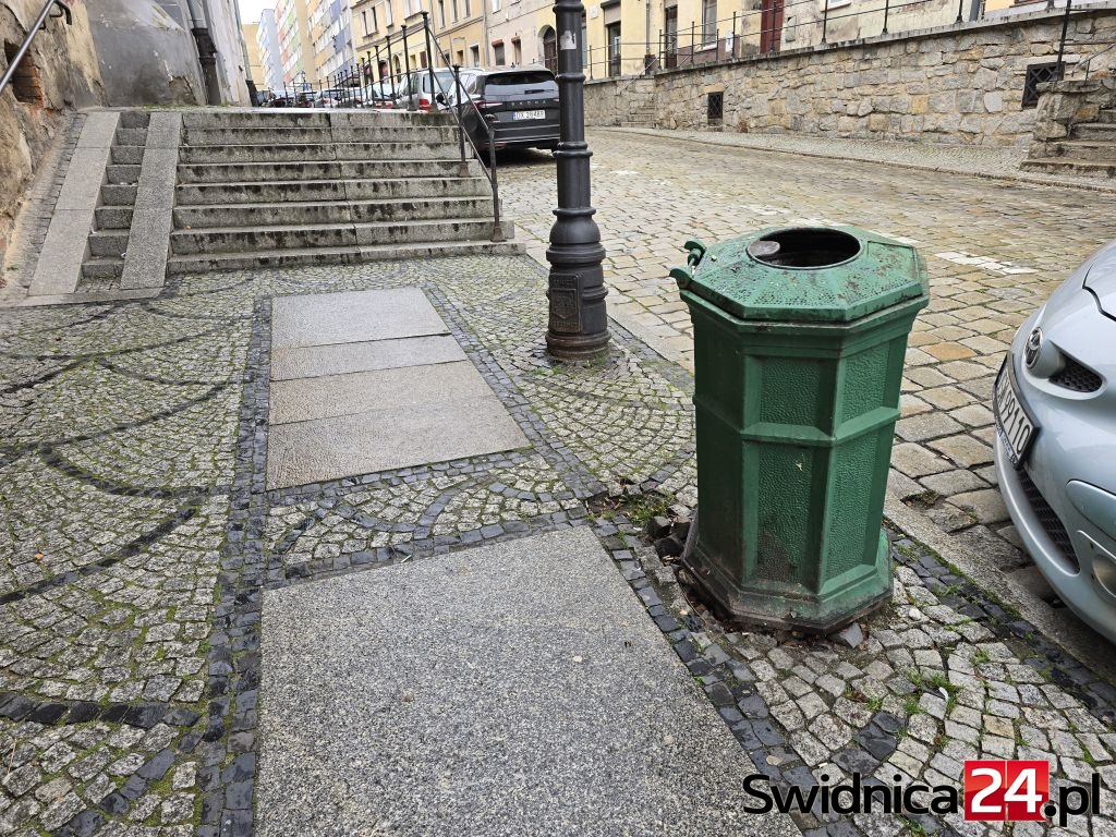 Ciężkie, metalowe pojemniki na odpady od lat są stałym elementem krajobrazu w centrum Świdnicy. Na ul. Pułaskiego kosz od dłuższego czasu był osadzony w chodniku byle jak. 20 października w tej sprawie skierowaliśmy pytania do urzędu miejskiego, próbując dociec, kto odpowiada za troskę o mała infrastrukturę w mieście i jakie działania zostały podjęte, by wyeliminować zagrożenie?