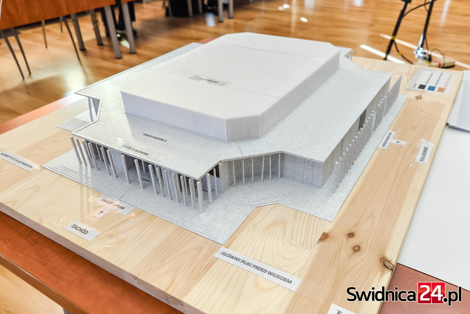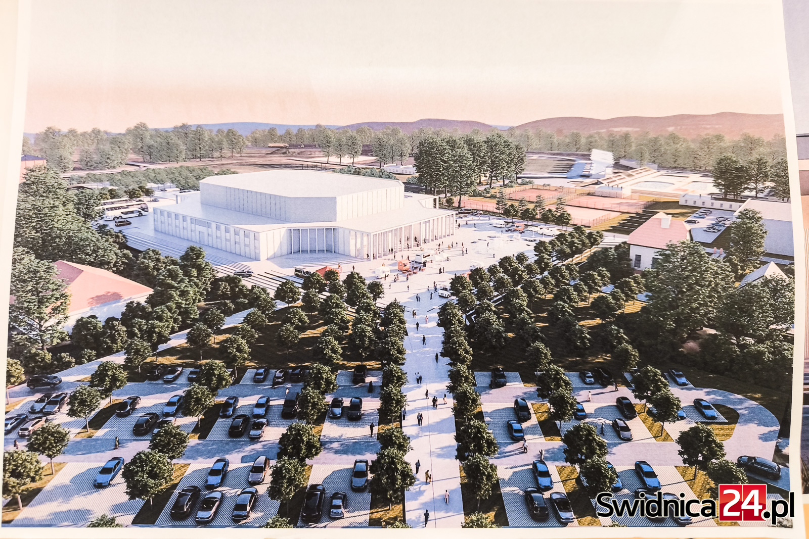 – Architektura obiektu odpowiadać będzie randze nowoczesnej hali widowiskowo-sportowej o znaczeniu miejskim. Nowoczesna forma bryła z klasycznym sznytem, elegancka, naturalnie wyglądająca elewacja. W zamyśle ta elewacja wykonana byłaby z tzw. współczesnego kamienia, czyli – w żargonie architektonicznym – z betonu architektonicznego. Wszystkie widoczne elementy zewnętrzne, stanowiące ozdobę bryły, tzw. arkady, zadaszenia, jak i sama elewacja, wykonane mają być z prefabrykowanych elementów żelbetowych. Zadaszenie płyty głównej to lekka, wyniesiona konstrukcja zwieńczająca budynek. Zakłada się stosowanie dużych przeszkleń w konstrukcji. Architekci celowo i świadomie odeszli od nawiązywania kubaturą czy architekturą tej hali do otoczenia. Hala ma stanowić dominantę w tym miejscu, ma być elementem wyróżniającym się. Co do zasady, jak każda hala widowiskowo-sportowa, nie jest elementem małym i nie jest to bryła, która wtopi się w otoczenie. Jej wielkość będzie powodowała, że będzie mocno wyeksponowana. Stąd też architekci zwracają uwagę na to, że powinna być klasyczna i elegancka, czyli ma to być coś, co będzie nie tylko służyło mieszkańcom Świdnicy, ale będzie też odpowiednio wyglądało – wskazywała Salus.