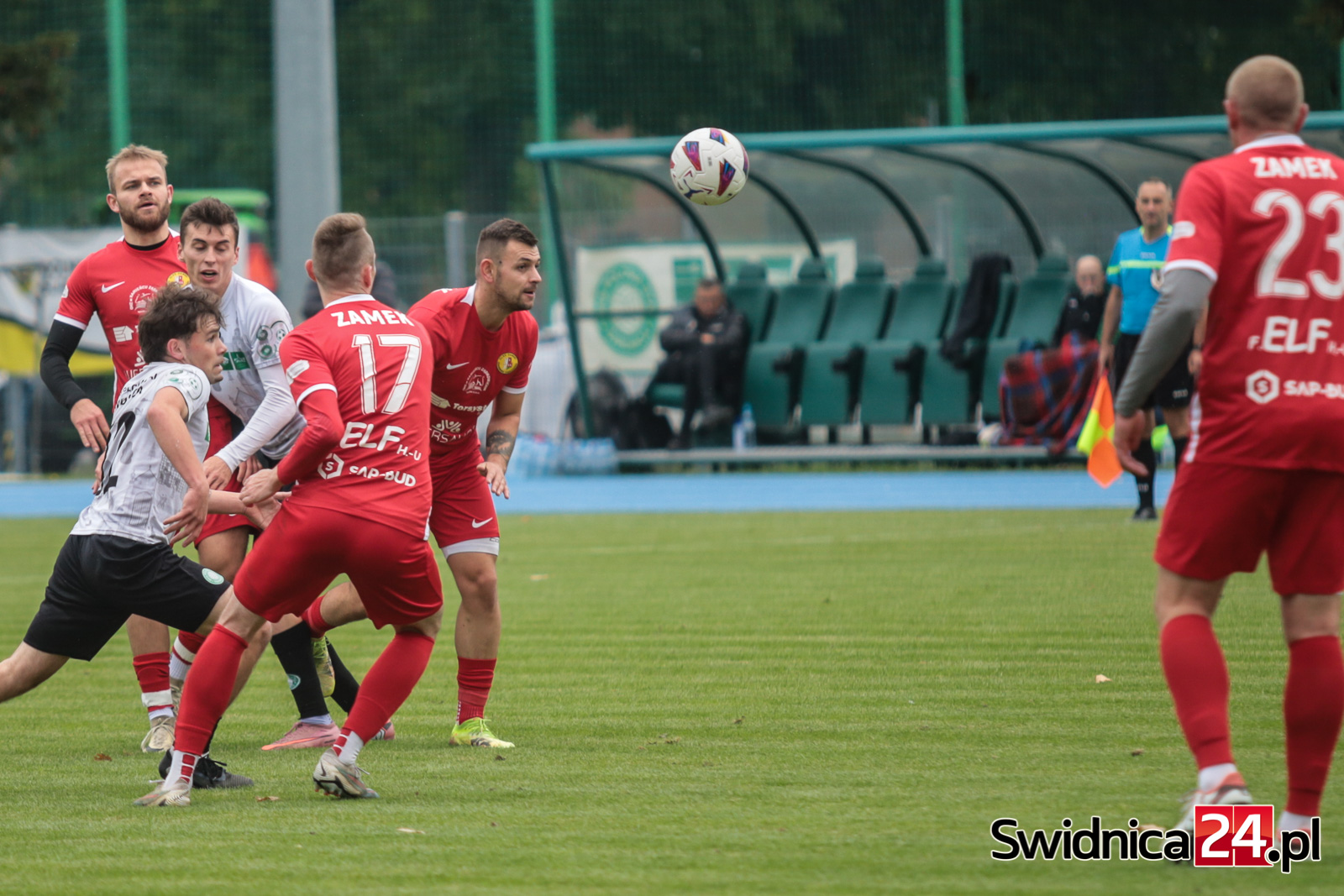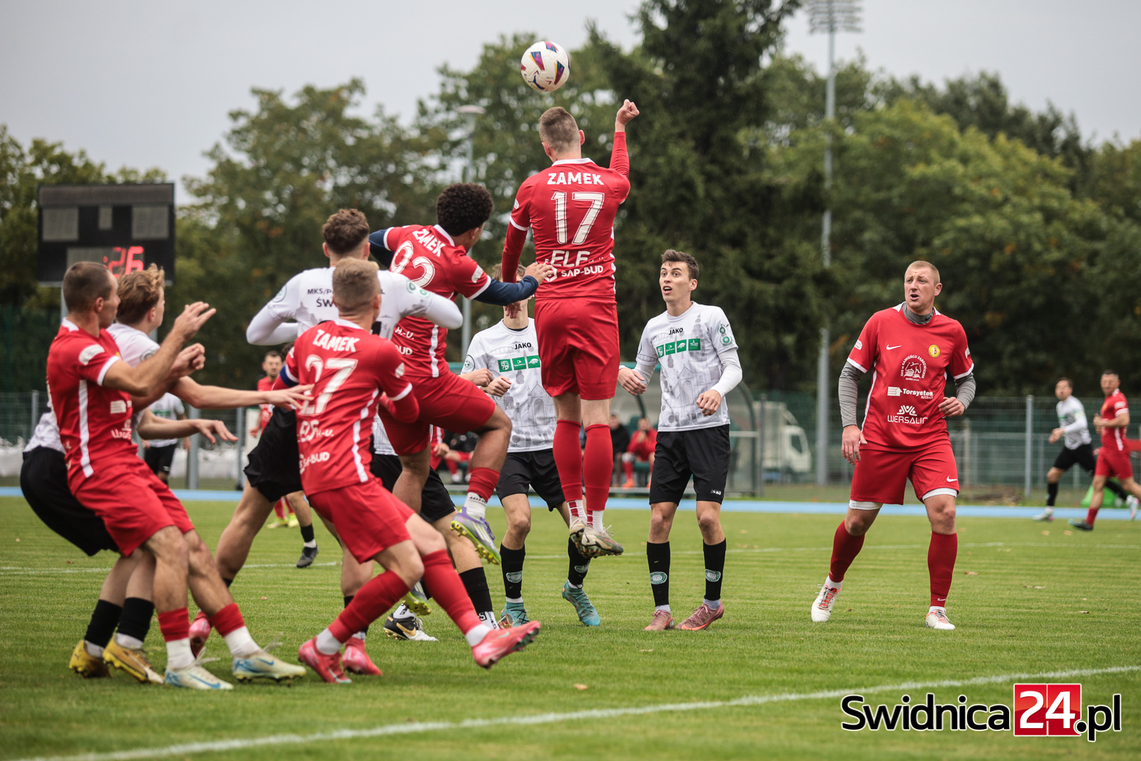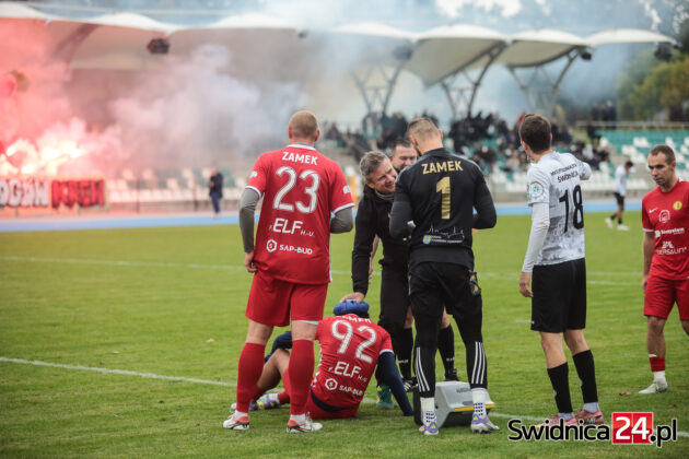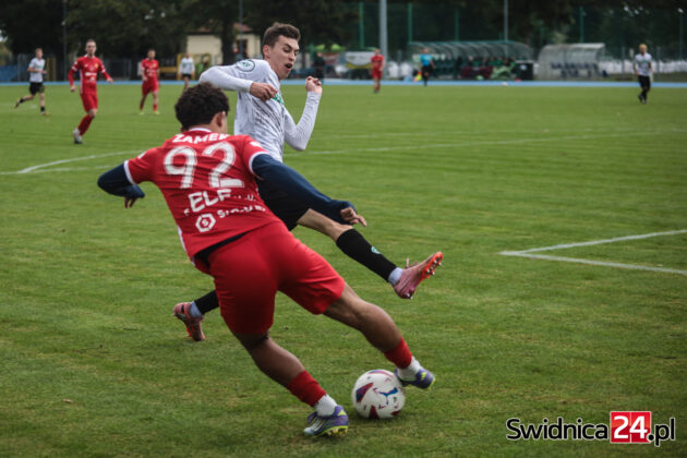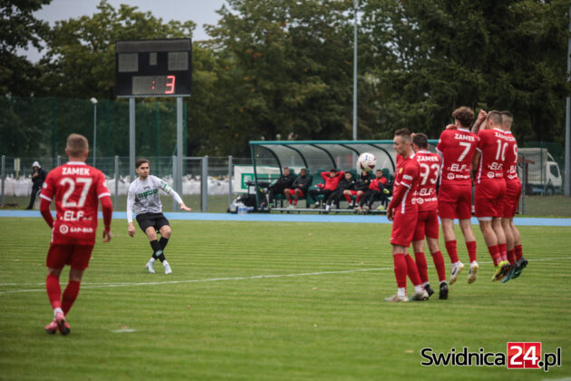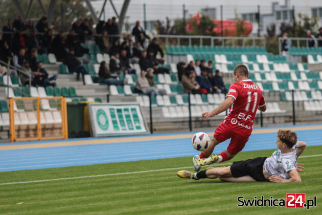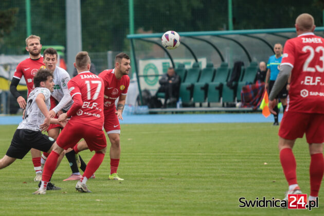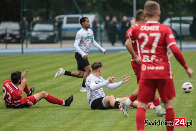 Po zmianie stron świdniczanie coraz mocniej „zacieśniali pętlę na szyi” piłkarzy Zamku. Przewaga zaczynała się robić coraz bardziej wyraźna. Wojciech Sowa uderzył głową minimalnie niecelnie, podobnie jak Hubert Lipiński, nie wykorzystaliśmy do tego sytuacji trzech na jednego po przechwycie i szybkim ataku. W końcu nadeszła 67. minuta. Mateusz Mojka dograł do Huberta Lipińskiego, a ten precyzyjnym strzałem z kilku metrów trafił na 1:0. W doliczonym czasie gry Mojka wykorzystał jeszcze sytuacji sam na sam z bramkarzem, trafiając na 2:0 dla miejscowych. W doliczonym czasie gry obie ekipy po jednym razie obiły obramowanie bramki. Nas uratował najpierw słupek, gości następnie poprzeczka po strzale głową naszego kapitana – Wojciecha Sowy.