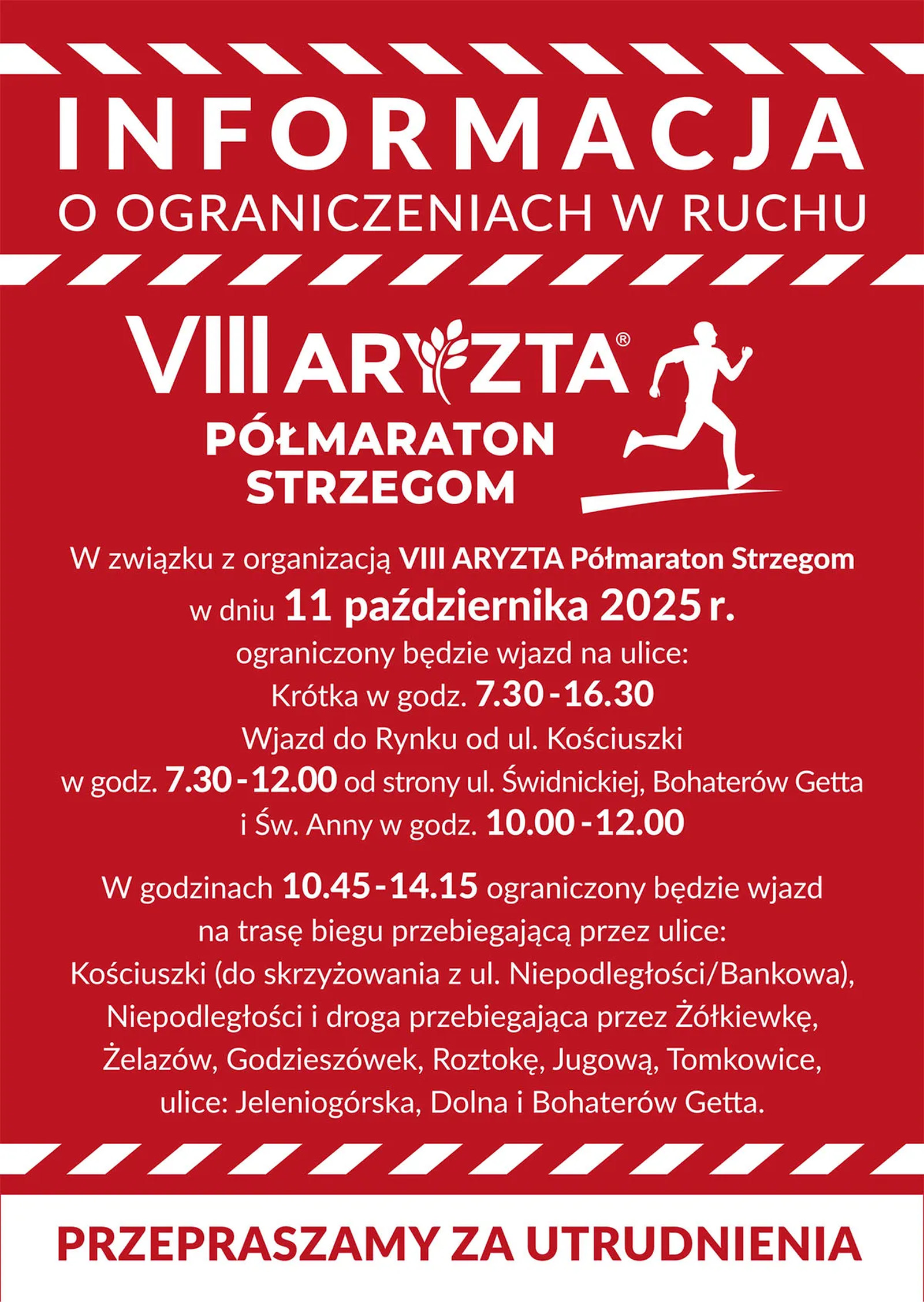W sobotę, 11 października odbędzie się VIII ARYZTA Półmaraton Strzegom, któremu towarzyszyć będą Bieg Piekarza oraz Bieg Ciasteczkowy dla dzieci i młodzieży. W związku z organizacją wydarzenia, na terenie gmin Strzegom oraz Dobromierz wystąpią czasowe utrudnienia w ruchu drogowym.