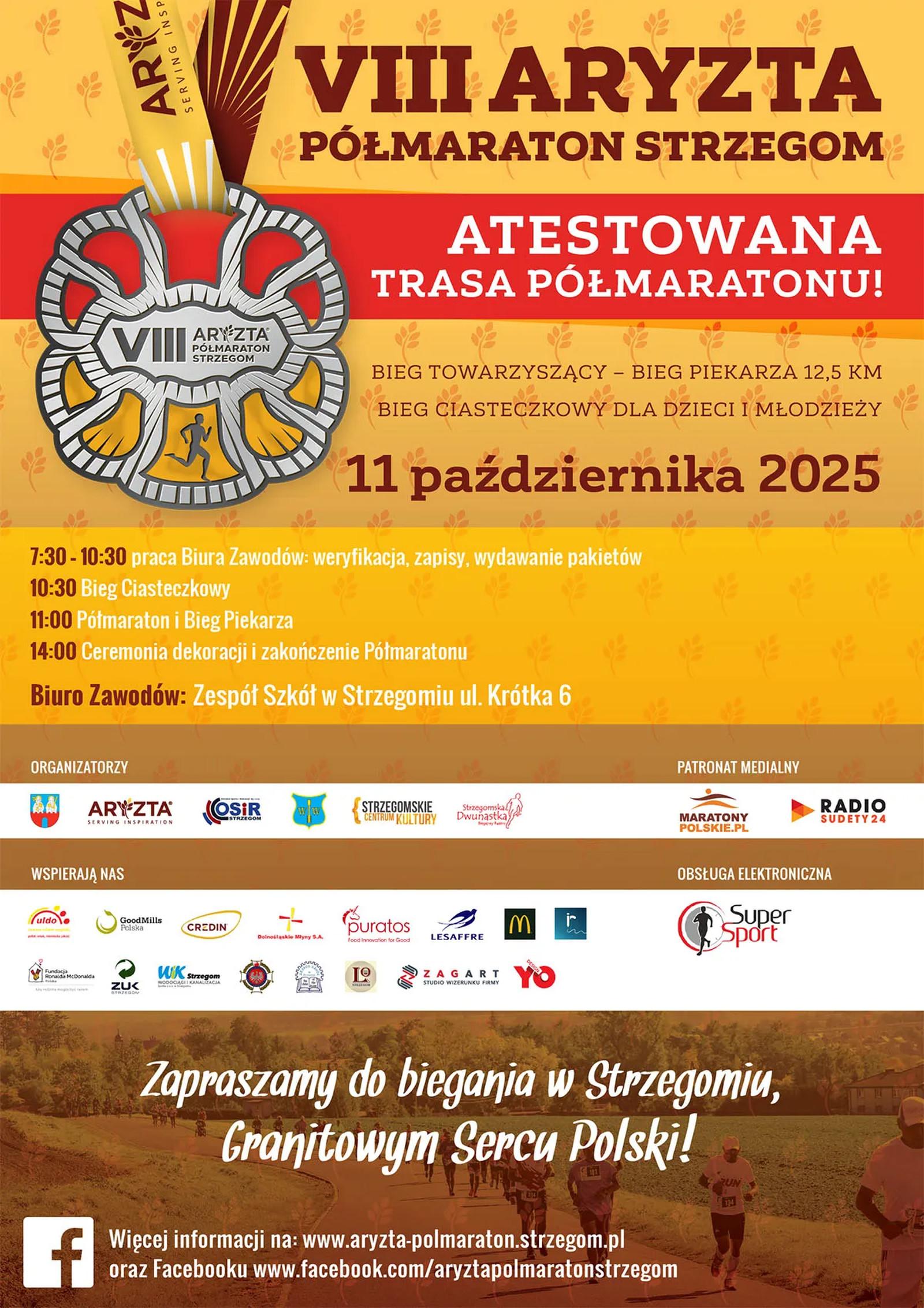 Godziny startu biegów: Bieg Ciasteczkowy (dzieci i młodzież) – godz. 10:30, Półmaraton i Bieg Piekarza – godz. 11:00. Przewidywany czas trwania półmaratonu: ok. 3,5 godziny. Start głównych biegów zaplanowano na strzegomskim Rynku, a meta zlokalizowana będzie na ul. Krótkiej w parku Strzegomskie Planty.