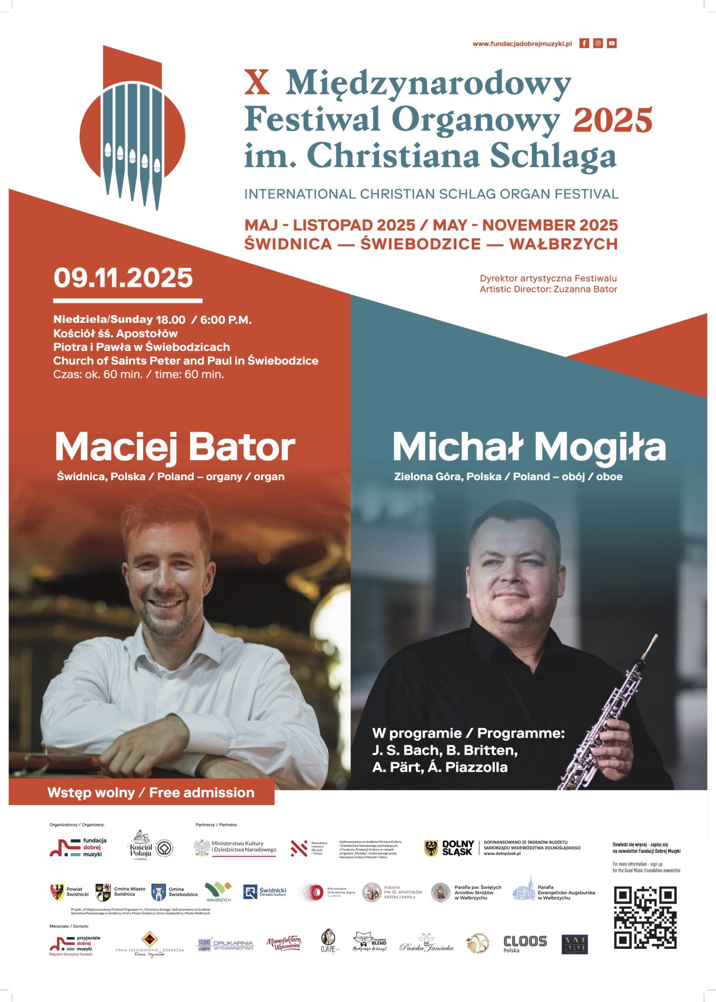 W niedzielny wieczór, 9 listopada 2025 roku o godzinie 18.00 w Kościele Świętych Apostołów Piotra i Pawła w Świebodzicach odbędzie się ostatni z koncertów X Międzynarodowego Festiwalu Organowego im. Christiana Schlaga. Wystąpią: Maciej Bator – organista związany ze Świdnicą oraz Michał Mogiła – oboista z Zielonej Góry. Wstęp wolny.