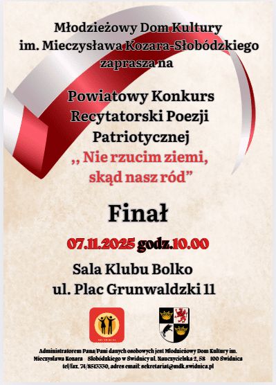 Młodzieżowy Dom Kultury w Świdnicy zaprasza wszystkich uczestników, opiekunów i miłośników poezji na finał Powiatowego Konkursu Poezji Patriotycznej „Nie rzucim ziemi, skąd nasz ród”, który odbędzie się w piątek, 7 listopada 2025 roku w Klubie Bolko (pl. Grunwaldzki 11). Początek o godzinie 10.00. – Podczas finału wysłuchamy najlepszych recytacji, poznamy laureatów konkursu oraz wspólnie uczcimy wartości patriotyczne poprzez piękno słowa poetyckiego – zapowiadają organizatorzy.