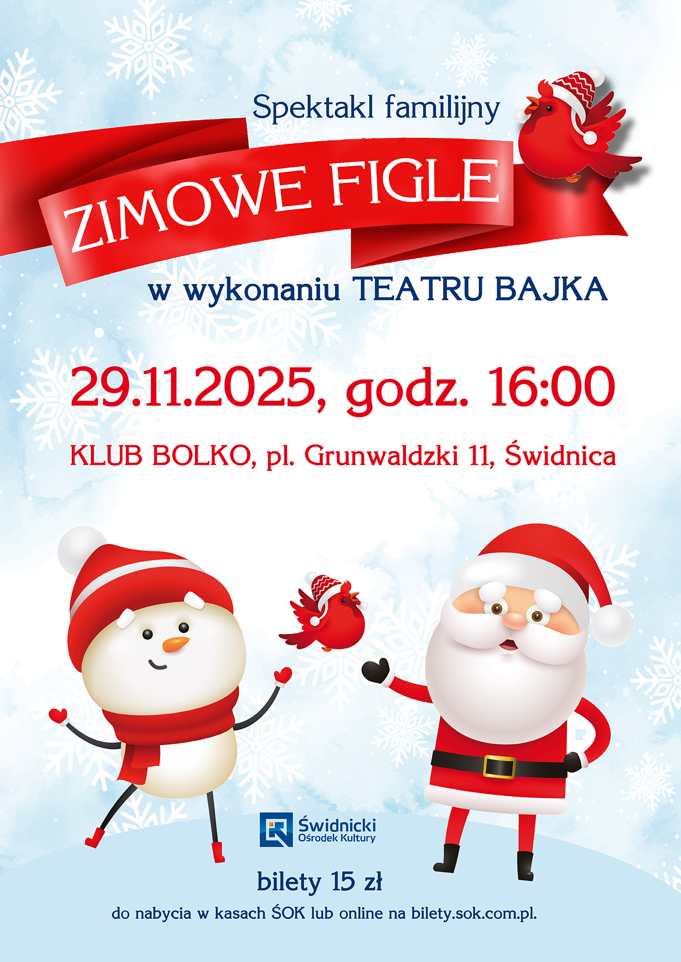 Świdnicki Ośrodek Kultury zaprasza na spektakl familijny „Zimowe figle”, który zaprezentowany zostanie w sobotę, 29 listopada o godz. 16.00 w Klubie Bolko (pl. Grunwaldzki 11). – ️Spektakl Teatru Bajka realizowany w żywym planie opowiada o nadchodzących świętach Bożego Narodzenia. Dzieci z widowni aktywnie uczestniczą w przedstawieniu, pomagając bohaterom w przygotowaniach do świąt. Ich nadejście zależy od pojawienia się pierwszej, błyszczącej gwiazdy, którą trzeba starannie wyczyścić. Przygotowanie świąteczne oraz produkcja prezentów odbywają się za „niebiańską bramą”. Czuwa nad nimi Aniołek – pomocnik Świętego Mikołaja, któremu jednak nieustannie przeszkadza psotny Diabełek, płatając rozmaite figle – opisują organizatorzy.