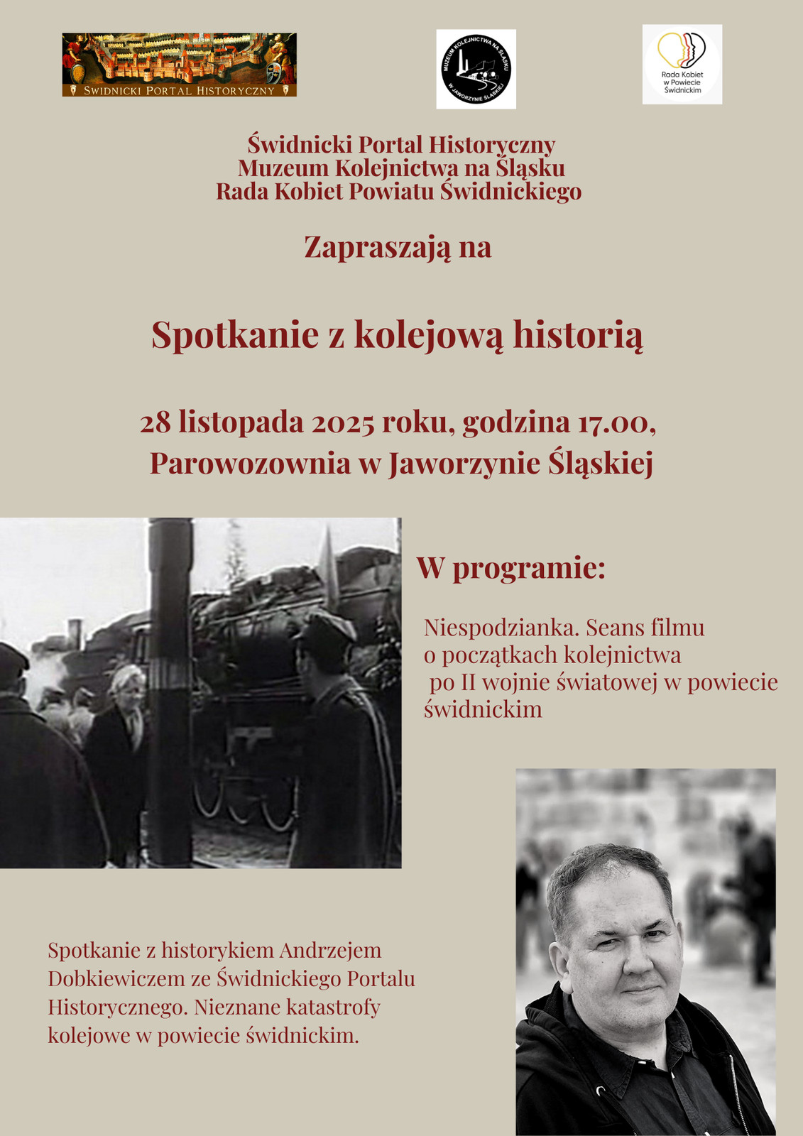 Świdnicki Portal Historyczny, Muzeum Kolejnictwa na Śląsku oraz Rada Kobiet Powiatu Świdnickiego zapraszają na „Spotkanie z kolejową historią”. Wydarzenie odbędzie się w piątek, 28 listopada w parowozowni w Jaworzynie Śląskiej O godzinie 14.00 odbędzie się seans filmowy z historią w tle – projekcja zapomnianego filmu fabularnego o pierwszych polskich kolejarzach z powiatu świdnickiego. Film opowiada o pionierach-kolejarzach ze Świdnicy i Jaworzyny Śląskiej. W tle dramatyczna historia zabezpieczania pierwszych parowozów po wojnie przed radzieckim rabunkiem oraz trudne polsko-niemieckie relacje. O wprowadzenie do filmu zadba Agnieszka Dobkiewicz – dziennikarka, publicystka i pisarka związana z Dolnym Śląskiem.