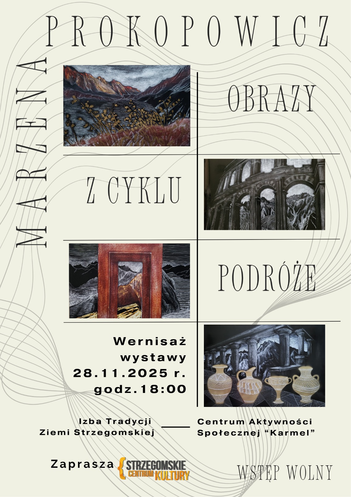 Strzegomskie Centrum Kultury zaprasza na wernisaż wystawy Marzeny Prokopowicz, który odbędzie się 28 listopada 2025 roku o godzinie 18.00 w Izbie Tradycji Ziemi Strzegomskiej mieszczącej się w Centrum Aktywności Społecznej „Karmel”. Będzie to spotkanie ze sztuką, która od lat porusza i inspiruje, a tym razem przybliży nam „Obrazy z cyklu Podróże”.