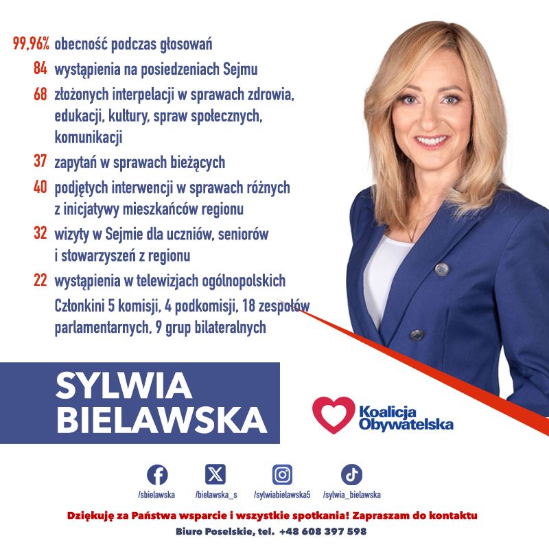 Dwa lata intensywnej pracy za nami. To czas spotkań, rozmów i wspólnego działania na rzecz ludzi, którzy mi zaufali. Dziękuję Państwu za wsparcie, za wszystkie sygnały i inspiracje do dalszej pracy. Jestem tu, by słuchać i działać – razem możemy więcej – podsumowuje posłanka Sylwia Bielawska.