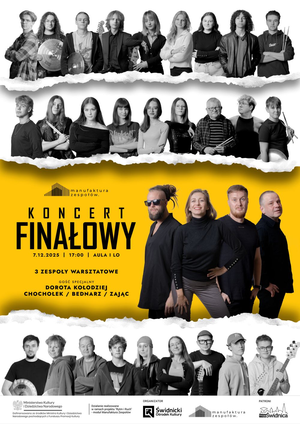 Połączyła ich pasja do muzyki. Dołączając do Manufaktury Zespołów byli po prostu instrumentalistami a teraz są częścią zespołów. Na scenie zobaczymy aż 4 grupy! Trzy z nich tworzą uczestnicy projektu a czwarty przygotowali ich instruktorzy: Bartosz Bednarz, Mateusz Chochołek, Dorota Kołodziej i Paweł Zając.