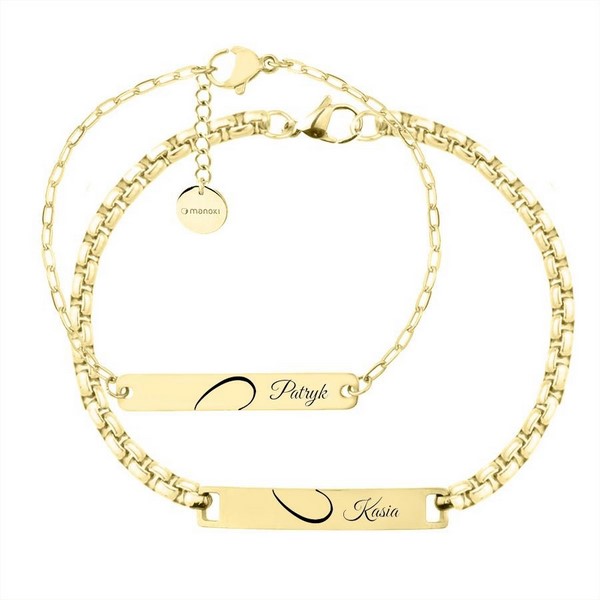 Wiele par lubi klasyczne, ponadczasowe zestawy biżuterii dla zakochanych. Jeśli szukasz właśnie takich modeli, wybierz dla siebie i swojej drugiej połówki pozłacane, łańcuchowe bransoletki z prostokątną blaszką. „Golden Connection” to wyjątkowy zestaw, który stanowi stylowy dodatek do każdego stroju. Co jednak najważniejsze, może stać się zupełnie wyjątkowym i niepowtarzalnym podarunkiem, dzięki możliwości wykonania indywidualnego grawera. Dla naszych Klientów przeznaczony jest intuicyjny kreator online. To w nim kilkoma ruchami można stworzyć doskonały, indywidualny projekt tekstu albo grafiki. Co ważne, zestaw jest trwały, odporny na różnego rodzaju odkształcenia czy uszkodzenia mechaniczne. Stal szlachetna jest wysokiej klasy materiałem, który nie odbarwia się, nie traci intensywności swoich barw, a także nie pozostawia śladów na skórze.