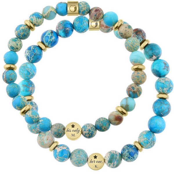 Jeśli zakochani uwielbiają naturalne minerały i kamienie, doskonałym wyborem będzie zestaw turkusowych bransoletek wykonanych z jaspisu. Pomiędzy uroczymi, naturalnymi kamieniami, znalazły się złote elementy wykończeniowe, w tym również płaskie, okrągłe blaszki, na których można umieścić inicjały, symbol czy inny, dowolnie wybrany grawer. Dodatkowo warto wiedzieć, że jaspis to kamień symbolizujący harmonię i spokój.