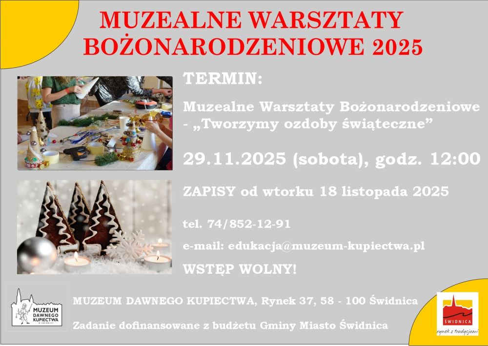 Muzeum Dawnego Kupiectwa z zaprasza dzieci i młodzież wraz z opiekunami na Muzealne Warsztaty Bożonarodzeniowe 2025. Kreatywne spotkanie będzie okazją do stworzenia oryginalnych świątecznych choinek. Zapisy ruszają we wtorek, 18 listopada. Ilość miejsc ograniczona.