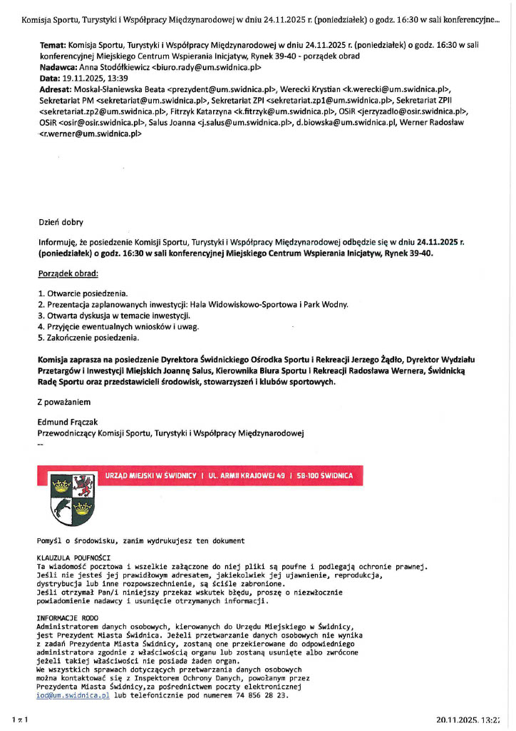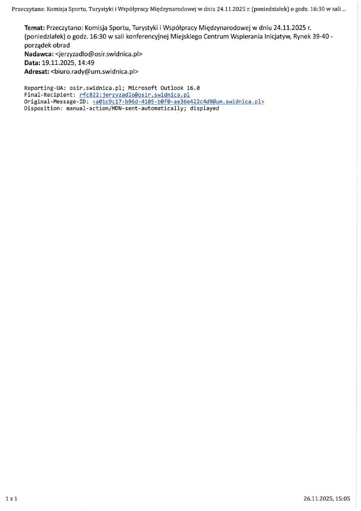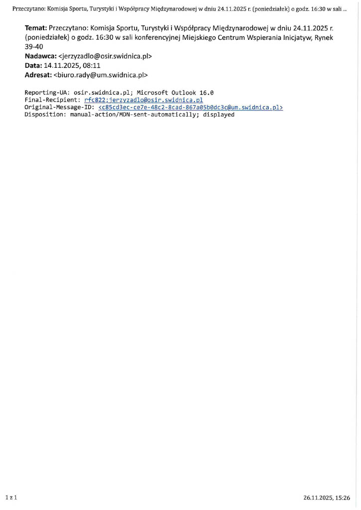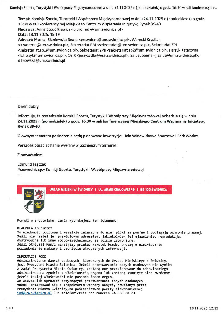 Korespondencja Biura Rady w sprawie planowanej w dniu 24 listopada komisji sportu: