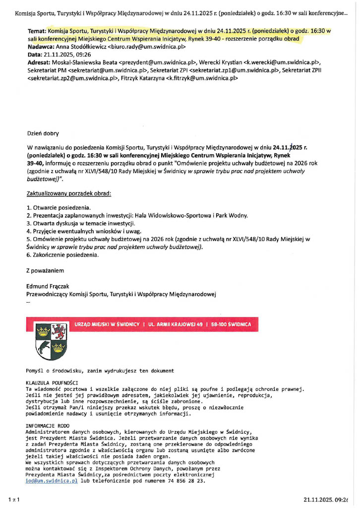 – Nie śledzę tego, co pani prezydent zamieszcza w mediach społecznościowych. Nie jest jednak prawdą, że nie była informowana o posiedzeniu komisji. Zaproszenia na moją prośbę zostały wystosowane drogą mejlową przez Biuro Rady Miejskiej zarówno do pani prezydent, jak i jej zastępców, dyrektorów wydziałów, Biura Sportu, Ośrodka Sportu i Rekreacji, radnych. Dowodem na to, że dotarły jest chociażby reakcja zastępcy prezydenta Krystiana Wereckiego, który przysłał pismo z wnioskiem o przełożenie posiedzenia – mówi Edmund Frączak. Z korespondencji, jaką dysponuje Biuro Rady wynika, że e-maile były wysyłane 13, 19 i 21 listopada. Zawierały informację o posiedzeniu, jego celu i programie. Były adresowane m.in. na prywatny adres e-mail Beaty Moskal-Słaniewskiej.