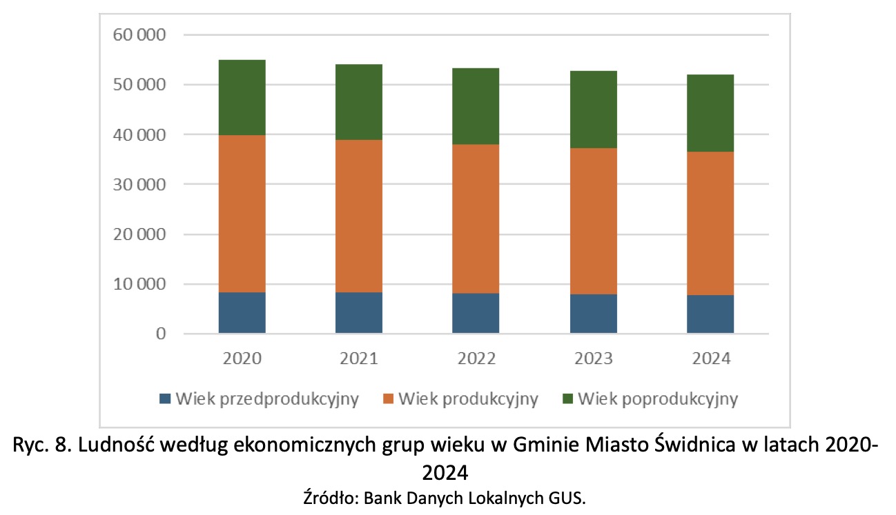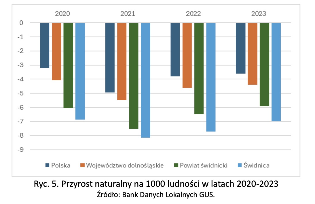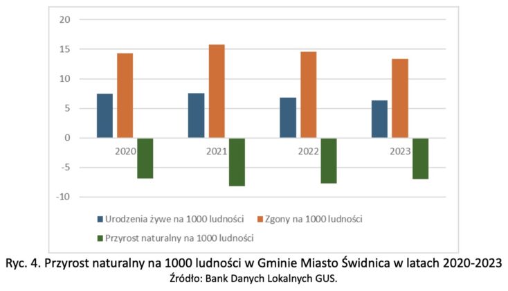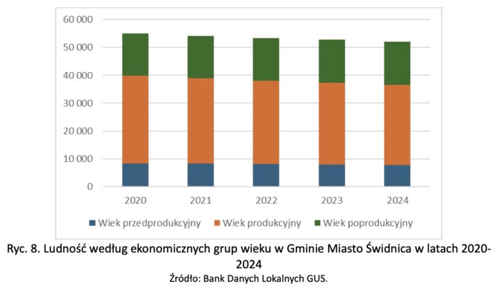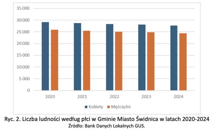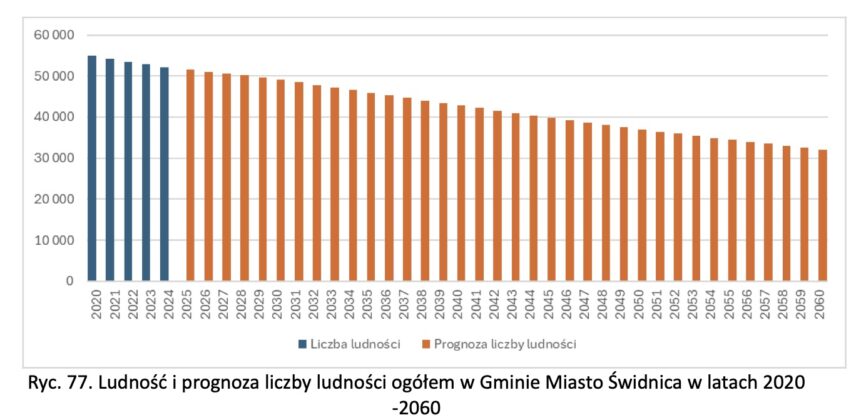Według danych Głównego Urzędu Statystycznego, w 2024 roku Świdnica liczyła 52 050 mieszkańców. W ostatnich pięciu latach odnotowano powolny spadek liczby ludności, z 55 013 w 2020 roku i zgodnie z prognozami demograficznymi ten spadek będzie postępował. – Spadek liczby ludności w gminie jest wynikiem dwóch procesów demograficznych – ujemnego przyrostu naturalnego oraz ujemnego salda migracji. W gminie znacznie więcej jest zgonów niż urodzeń żywych, stąd przyrost naturalny w latach 2020-2023 był ujemny. W 2023 roku wyniósł -6,98 na 1000 ludności. I choć Polska oraz województwo dolnośląskie również odnotowują ujemny przyrost naturalny to gmina ma ten przyrost jeszcze bardziej ujemny, za co odpowiada zarówno mniejsza liczba urodzeń, jak i większa liczba zgonów – czytamy w „Strategii Rozwiązywania Problemów Społecznych w Gminie Miasto Świdnica na lata 2026-2032”, którą w piątek uchwalili świdniccy radni.