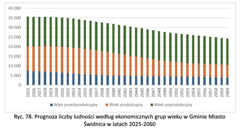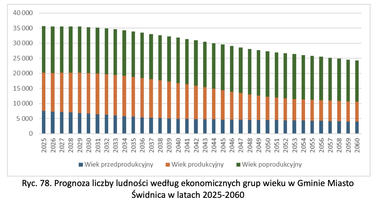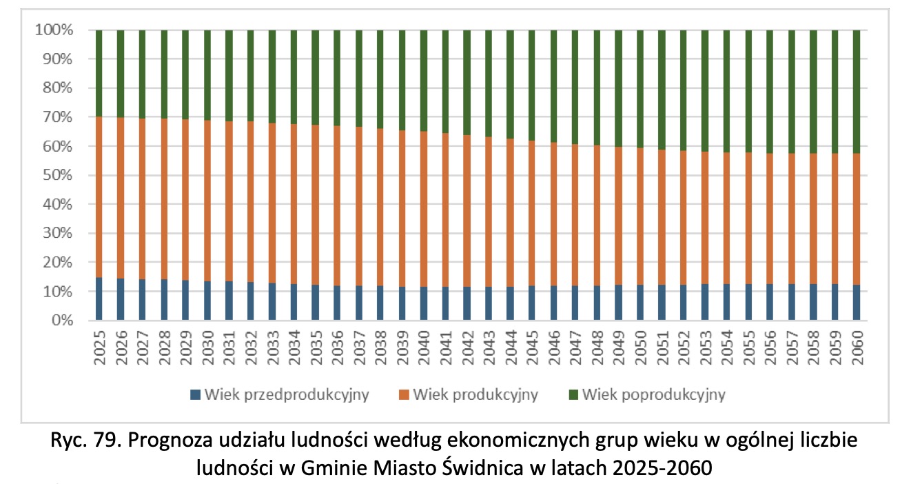 Prognoza demograficzna przewiduje również znaczący wzrostu udział osób w wieku poprodukcyjnym, zaś zmaleje udział osób w wieku produkcyjnym i przedprodukcyjnym. – Udział ludności w wieku przedprodukcyjnym zmaleje z szacowanego na rok 2025 poziomu 14,7% do 12,3% w 2035 roku, najniższy poziom – 11,6% osiągnie w latach 2039-2043, a następnie wzrośnie i w 2060 roku szacowany jest na 12,3%. Udział ludności w wieku produkcyjnym spadnie z szacowanego na rok 2025 poziomu 55,4%, do 55,1% w roku 2035 i po roku 2040 będzie spadał bardziej intensywnie by osiągnąć 45,2% w roku 2060. Udział ludności w wieku poprodukcyjnym wzrośnie z szacowanego na rok 2025 poziomu 29,9% do 32,7% w 2035 roku i 42,5% w 2060 roku – wskazano.