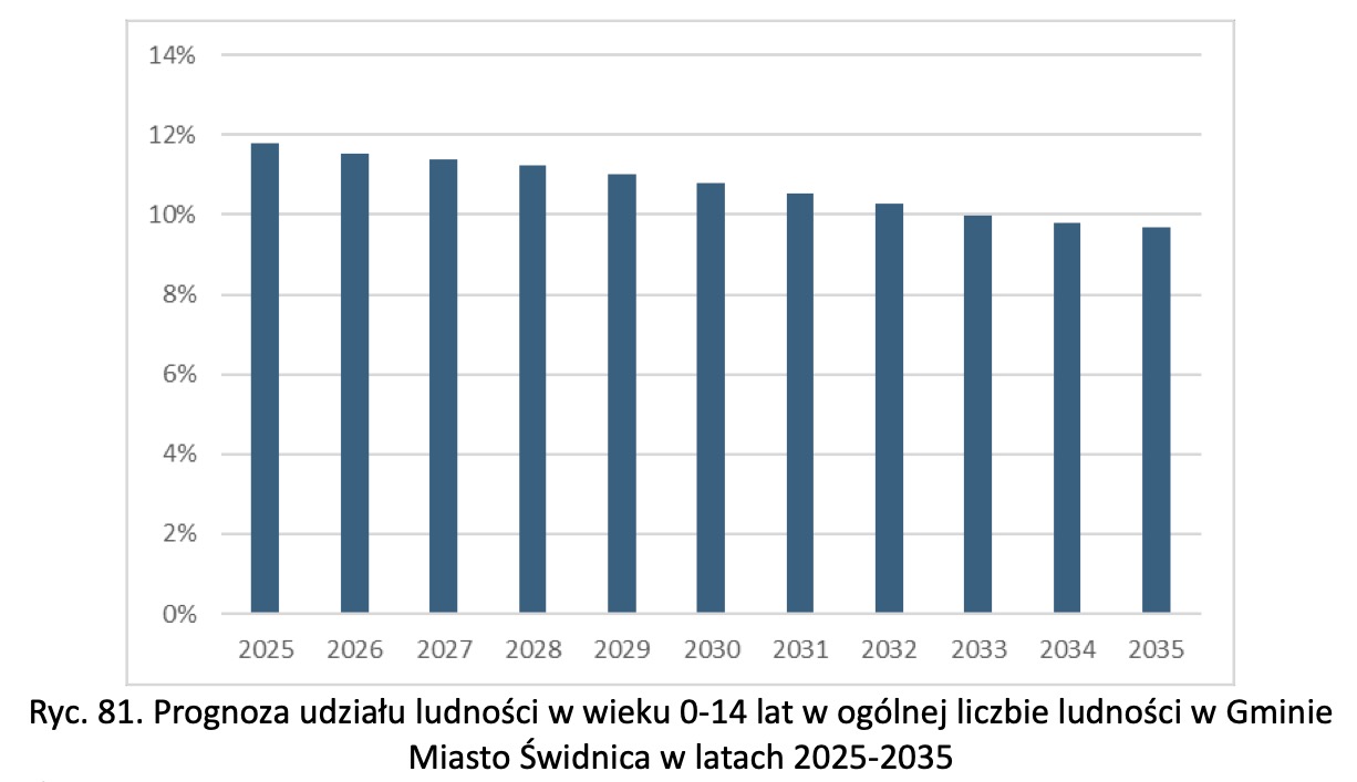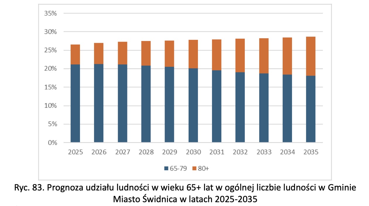 Szczególną uwagę zwrócono na zmianę liczby ludności wśród najmłodszych i najstarszych mieszkańców w perspektywie najbliższych 10 lat. – Liczba dzieci w wieku do 14 lat spadnie o 1,6 tys. – z prognozowanych na rok 2025 6 082 do 4 447. Zmniejszy to obciążenie instytucji opieki nad dziećmi do lat 3, przedszkoli i szkół podstawowych i niesie wyzwania dla organizacji sieci placówek. Udział najmłodszej kategorii wiekowej w ogólnej liczbie ludności spadnie z prognozowanych na rok 2025 11,8% do 9,7% w 2035 roku. Jeśli chodzi o seniorów powyżej 65 roku prognozuje się, że ich liczba w latach 2025-2035 spadnie z 13 701 do 13 152. (…) Prognozowany ogólny udział seniorów w ludności w gminie wzrośnie z 26,5% do 28,6%. Wzrost liczby najstarszych seniorów niesie za sobą duże wyzwania związane głównie z organizacją działań o charakterze opiekuńczym i wspierającym seniorów niesamodzielnych, potrzebujących pomocy w codziennym funkcjonowaniu – dodano.