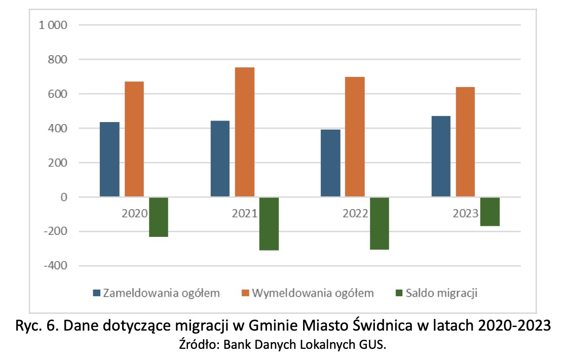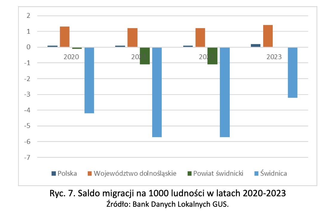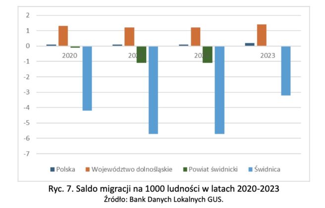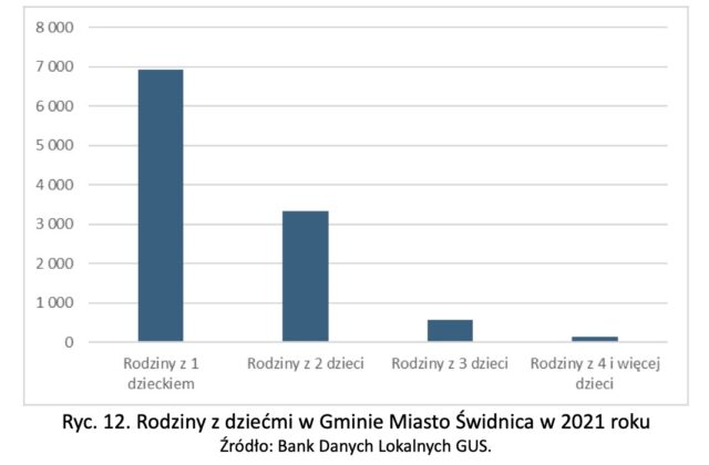 W opracowaniu zwrócono również uwagę na ujemne saldo migracji, które wynika z faktu przewagi wymeldowań nad zameldowaniami. Inaczej mówią, więcej osób opuszcza miasto niż się do niego przeprowadza. – W 2023 roku saldo migracji wyniosło -168 osób, czyli -3,2 na 1000 ludności. Wskazać należy, że województwo dolnośląskie ma dodanie saldo migracji, powiat świdnicki nieznacznie ujemne lub przyjmujące bilans zerowy, zaś Gmina ujemne we wszystkich latach w okresie 2020-2023 – wskazano w dokumencie. Zauważono również, że 69,1% ogółu świdnickich rodzin posiadało dzieci. – Dominują rodziny z jednym dzieckiem, bardzo rzadko rodziny mają 4 i więcej dzieci – w Gminie było zaledwie 139 takich rodzin. Średnio rodzina w Gminie liczyła 2,5 osoby, a więc mniej niż średnio rodzina w kraju, województwie dolnośląskim i powiecie – stwierdzono.