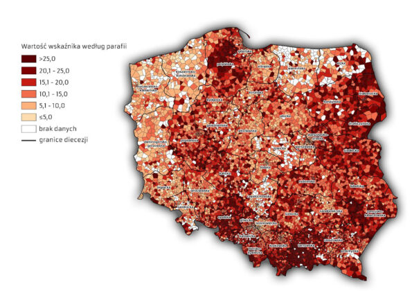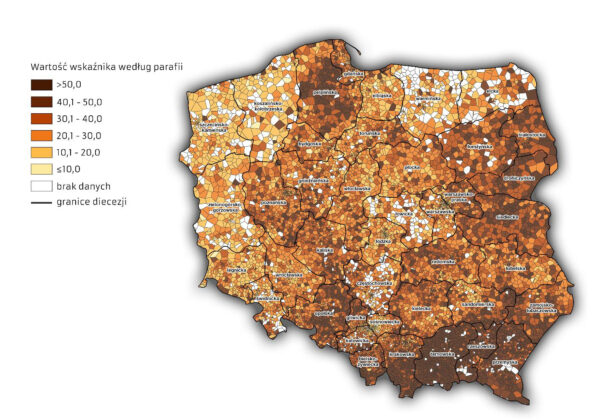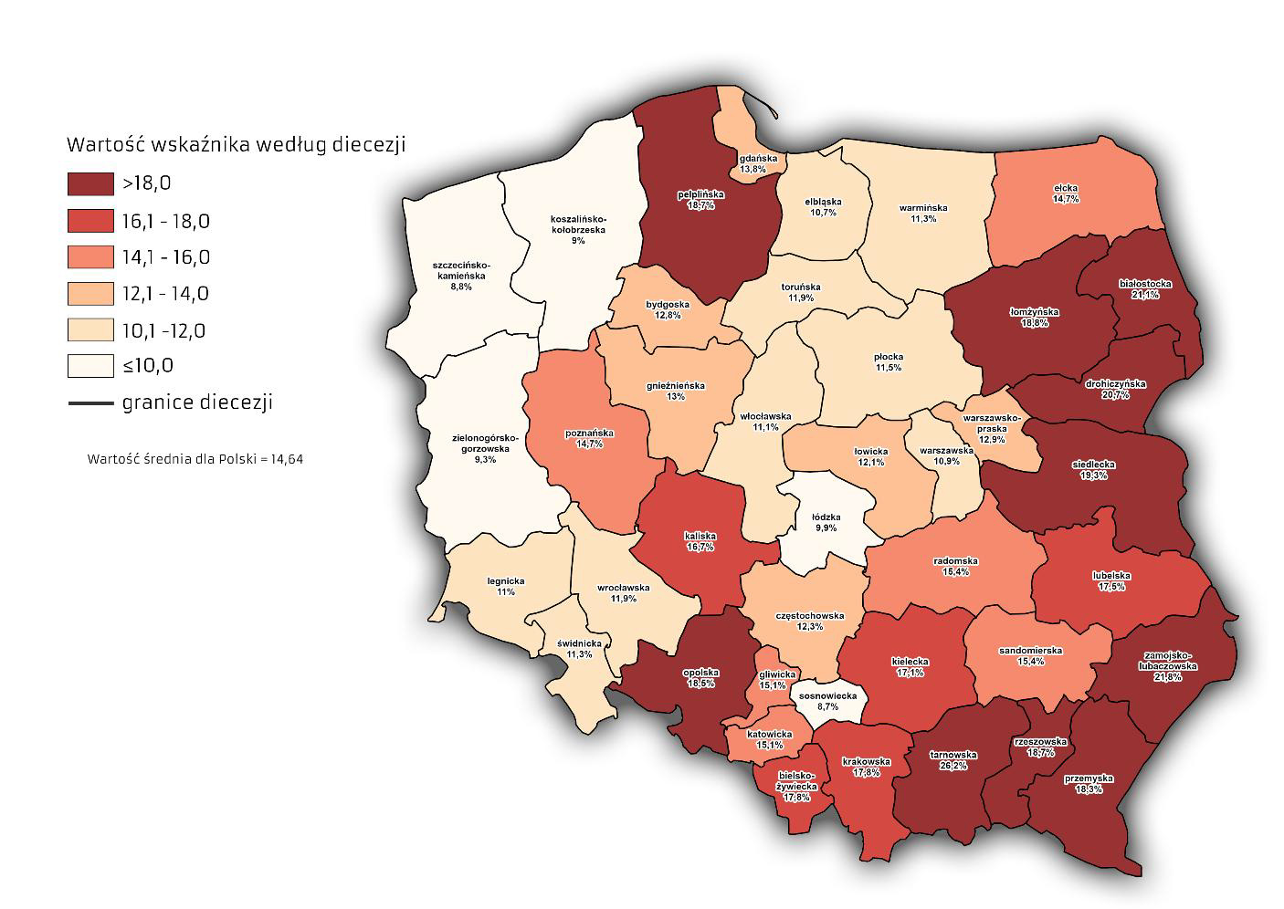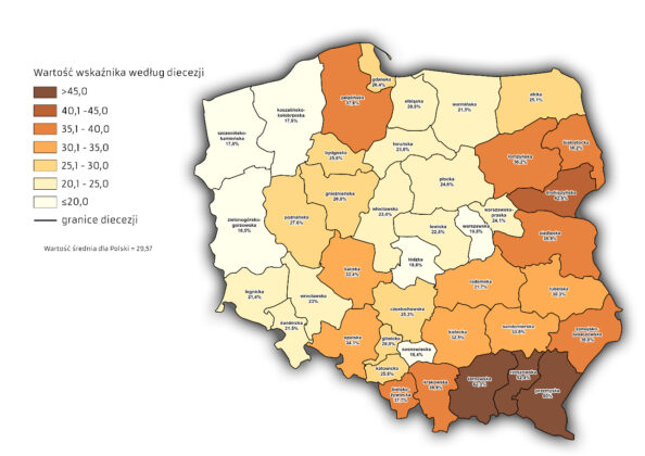 Najwyższy wskaźnik dominicantes odnotowano w diecezjach: tarnowskiej (62,3%), rzeszowskiej (52,4%) i przemyskiej (50,0%), a najniższy w diecezjach: koszalińsko-kołobrzeskiej (17,53%), szczecińsko-kamieńskiej (17,59%) i sosnowieckiej (18,40%). Z kolei najwyższy wskaźnik communicantes odnotowano w diecezjach: tarnowskiej (26,2%), zamojsko-lubaczowskiej (21,8%) oraz białostockiej (21,2%), a najniższy w diecezjach: sosnowieckiej (8,65%), szczecińsko-kamieńskiej (8,85%) i koszalińsko-kołobrzeskiej (8,98%).
