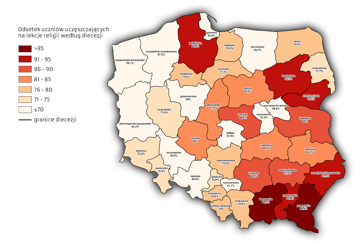 Najwyższy odsetek uczniów uczęszczających na lekcje religii odnotowano w diecezji tarnowskiej (96,1%), przemyskiej (95,8%) oraz rzeszowskiej (92,4%), zaś najniższy w diecezji warszawskiej (53,3%), sosnowieckiej (59,1%) i wrocławskiej (59,9%). W przypadku diecezji świdnickiej na zajęcia uczęszczało 72,8% uczniów (w roku szkolnym 2023/2024 było to 73,9%, w roku szkolnym 2022/2023 – 77,5%, w roku szkolnym 2021/2022 – 80,9% uczniów, w roku szkolnym 2020/2021 – 82,0% uczniów, w roku szkolnym 2019/2020 – 83,5% uczniów, a w roku szkolnym 2018/2019 – 87,5% uczniów).