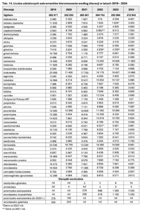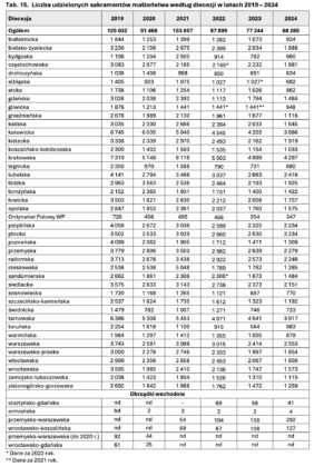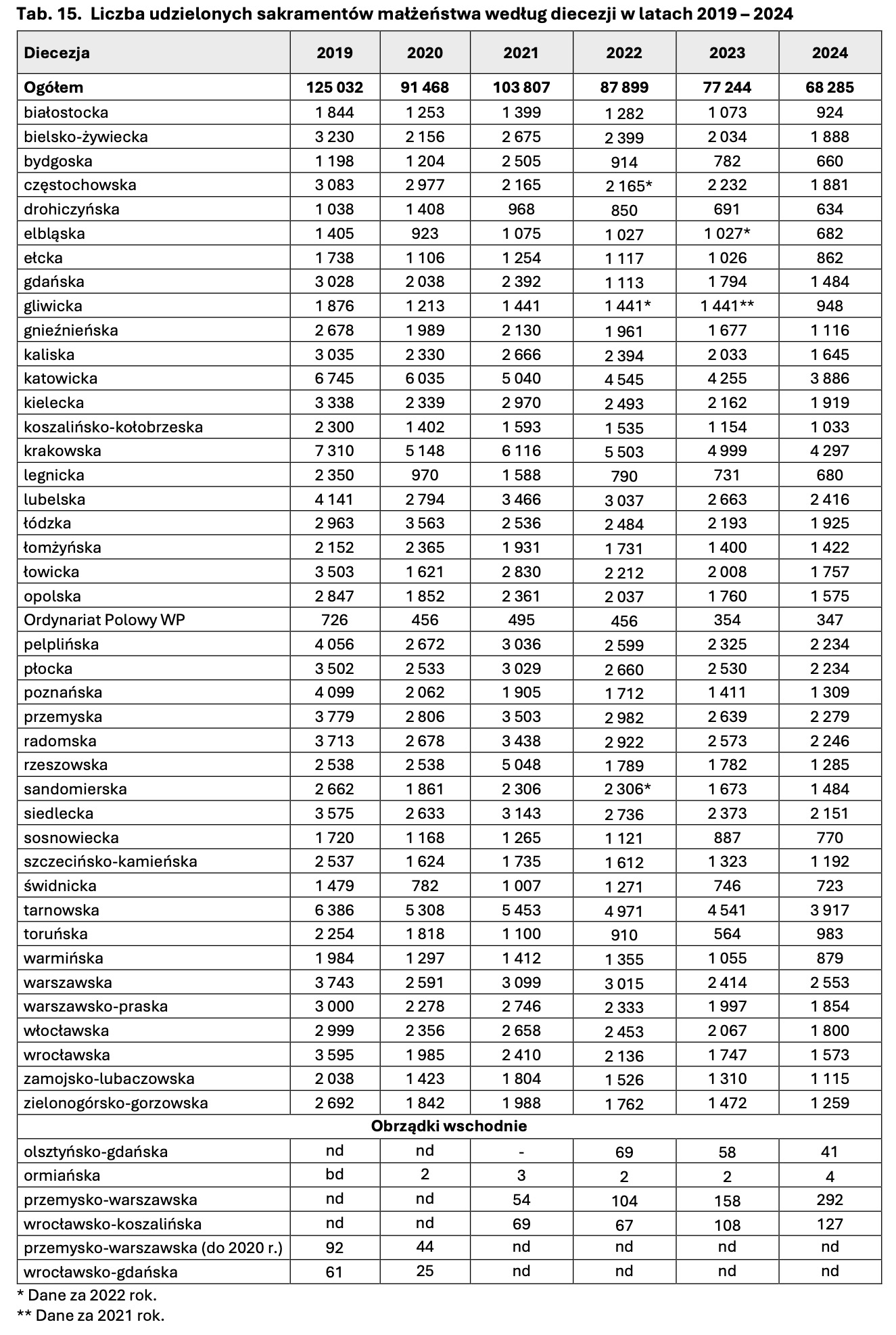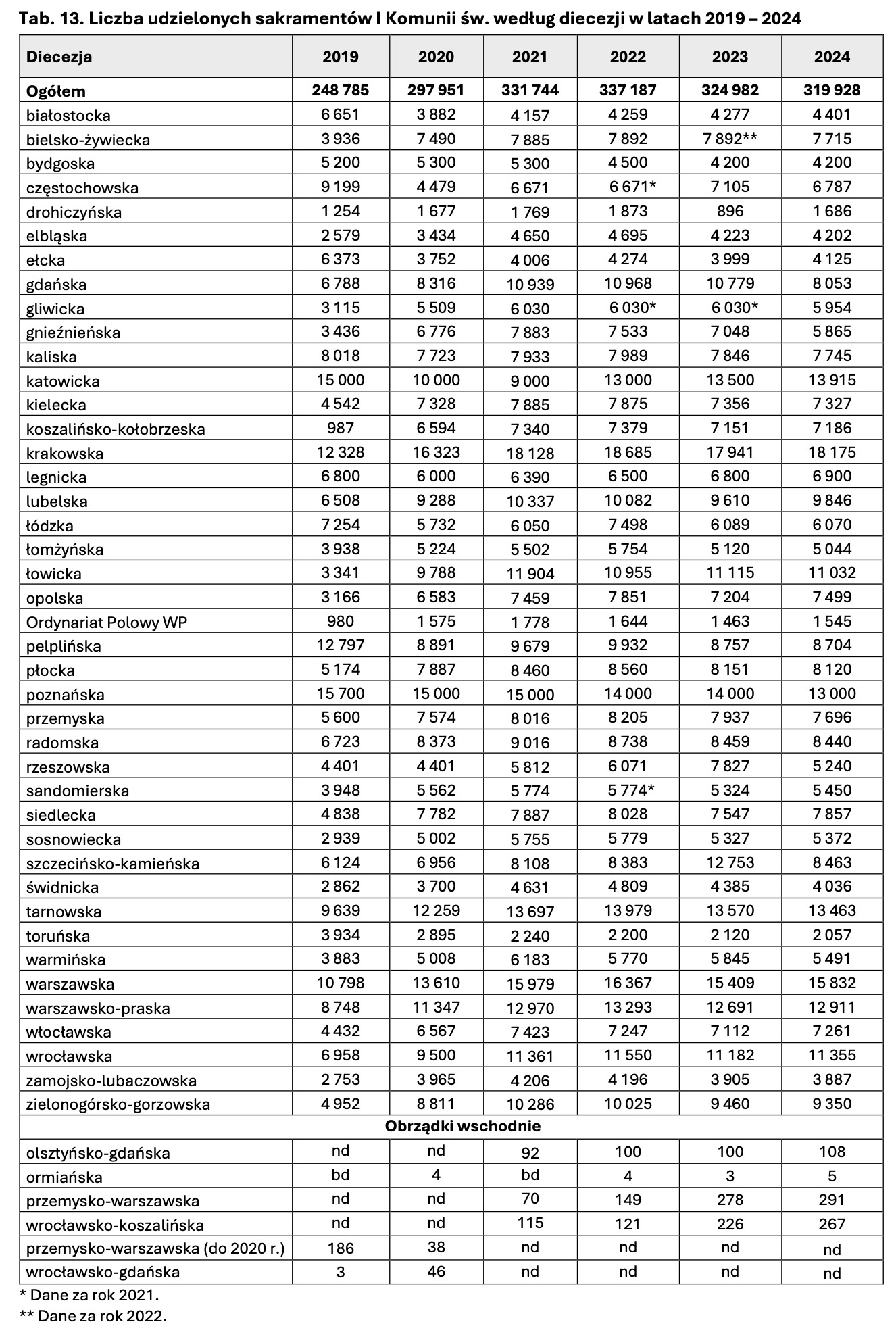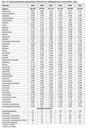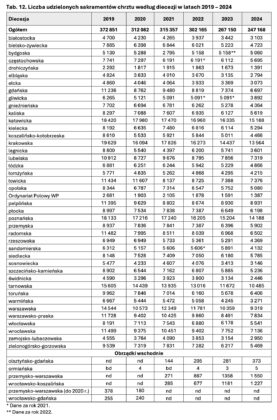 – W 2024 roku sakrament Chrztu św. udzielono 247,2 tys. osobom, czyli o 7,5 p. proc. mniej niż w roku poprzednim. Do I Komunii św. przystąpiło prawie 320 tys. osób (spadek o 1,5 p. proc.). W przypadku sakramentu bierzmowania przyjęło go blisko 213 tys. osób (spadek o 27,6 p. proc.). Sakrament małżeństwa został udzielony 68,3 tys. parom (spadek o 11,6 p. proc.). Liczby dotyczące sakramentów ilustrują trend demograficzny i przemiany kulturowe polskiego społeczeństwa – zmiany wyznawanych wartości. Na poziomie sakramentów zauważalne są przemiany demograficzne i kulturowe. Spadki liczby chrztów i ślubów związane są bowiem ze zmianami demograficznymi (spadek liczby urodzeń), natomiast spadek liczby zawieranych sakramentalnych małżeństw jest skutkiem zmian kulturowych – wskazują twórcy opracowania.