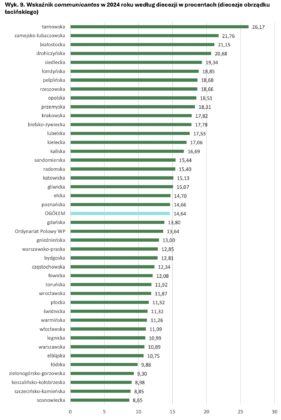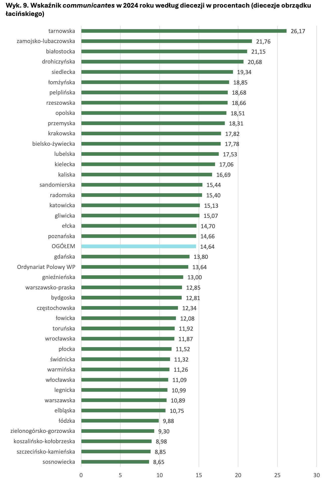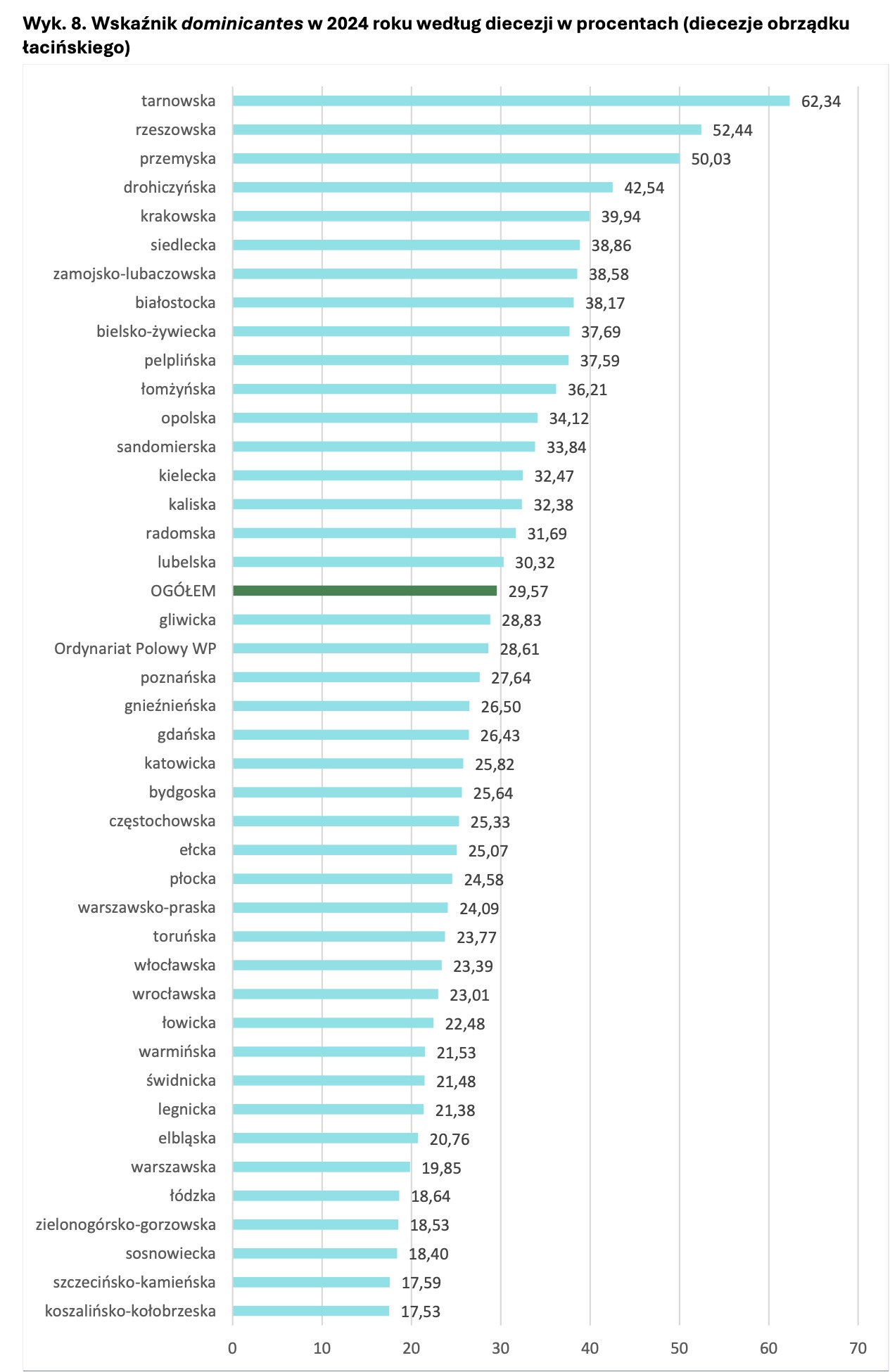 Zgodnie z wynikami ogólnopolskiego liczenia wiernych, które zostało przeprowadzone 13 października 2024 roku, w całym kraju w niedzielnej mszy uczestniczyło 29,6% zobowiązanych katolików, natomiast 14,6% przystąpiło do komunii. – W stosunku do 2023 roku oznacza to wzrost wskaźnika dominicantes [tj. osób uczestniczących w niedzielnej mszy – red.] o 0,57 p. proc. oraz wzrost communicantes [tj. osób przystępujących do komunii] o 0,64 p. proc. Istotne, że ten trend zmian odnotowany jest w niemal wszystkich diecezjach. Można więc zauważyć, że spadek praktyk wywołanych ograniczeniami epidemicznymi zatrzymał się (przed pandemią COVID-19 wskaźnik dominicantes wynosił bowiem 36,9%, a communicantes 16,7%) – wskazano w opracowaniu.