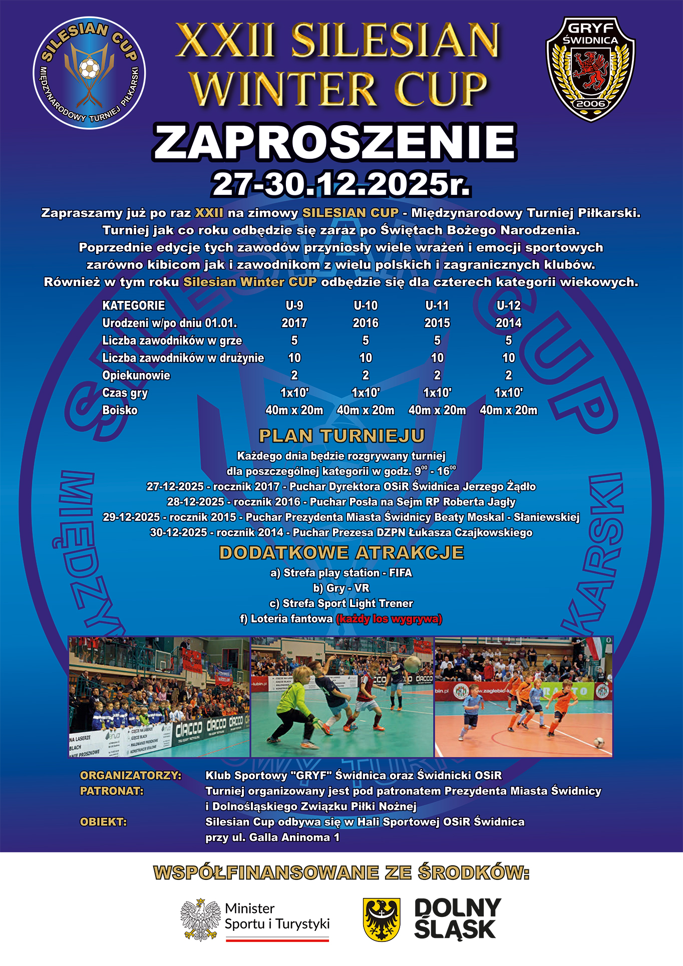Już po raz dwudziesty drugi w okresie między świętami Bożego Narodzenia i Nowym Rokiem w Świdnicy odbędzie się halowy turniej piłkarski Silesian Winter Cup. Od 27 do 30 grudnia w hali sportowo-widowiskowej im. Haliny Aszkiełowicz-Wojno Świdnickiego Ośrodka Sportu i Rekreacji zaprezentuje 48 zespołów z Polski i Czech.