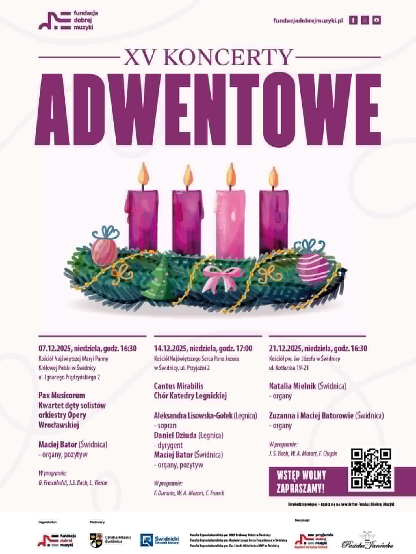 Na chwile przedświątecznej zadumy, wprowadzające w okres Bożego Narodzenia, ponownie zaprasza Fundacja Dobrej Muzyki. W tym roku publiczność będzie miała okazję uczestniczyć w trzech wyjątkowych spotkaniach z muzyką dawną i klasyczną, które odbędą się w trzech świdnickich świątyniach. XV edycję Koncertów Adwentowych rozpocznie występ kwartetu Pax Musicorum oraz organisty Macieja Batora już w niedzielę, 7 grudnia. Wstęp wolny.