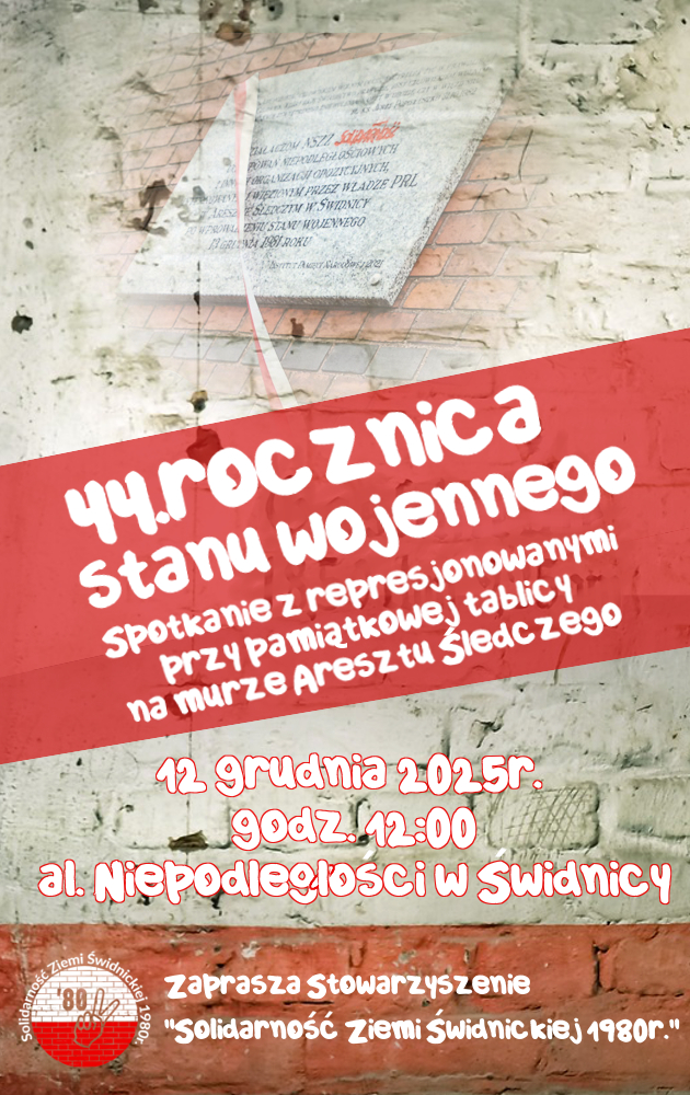 Na spotkanie z okazji 44. rocznicy wprowadzenia w Polsce stanu wojennego zaprasza Stowarzyszenie „Solidarność Ziemi Świdnickiej 1980r.”, które powołali represjonowani działacze pierwszego NSZZ Solidarność. Współpraca Areszt Śledczy w Świdnicy. Uroczystość przy tablicy pamiątkowej na murze Aresztu Śledczego (od al. Niepodległości) rozpocznie się o godz. 12.00 i będzie połączona z lekcją obywatelską dla świdnickich licealistów.