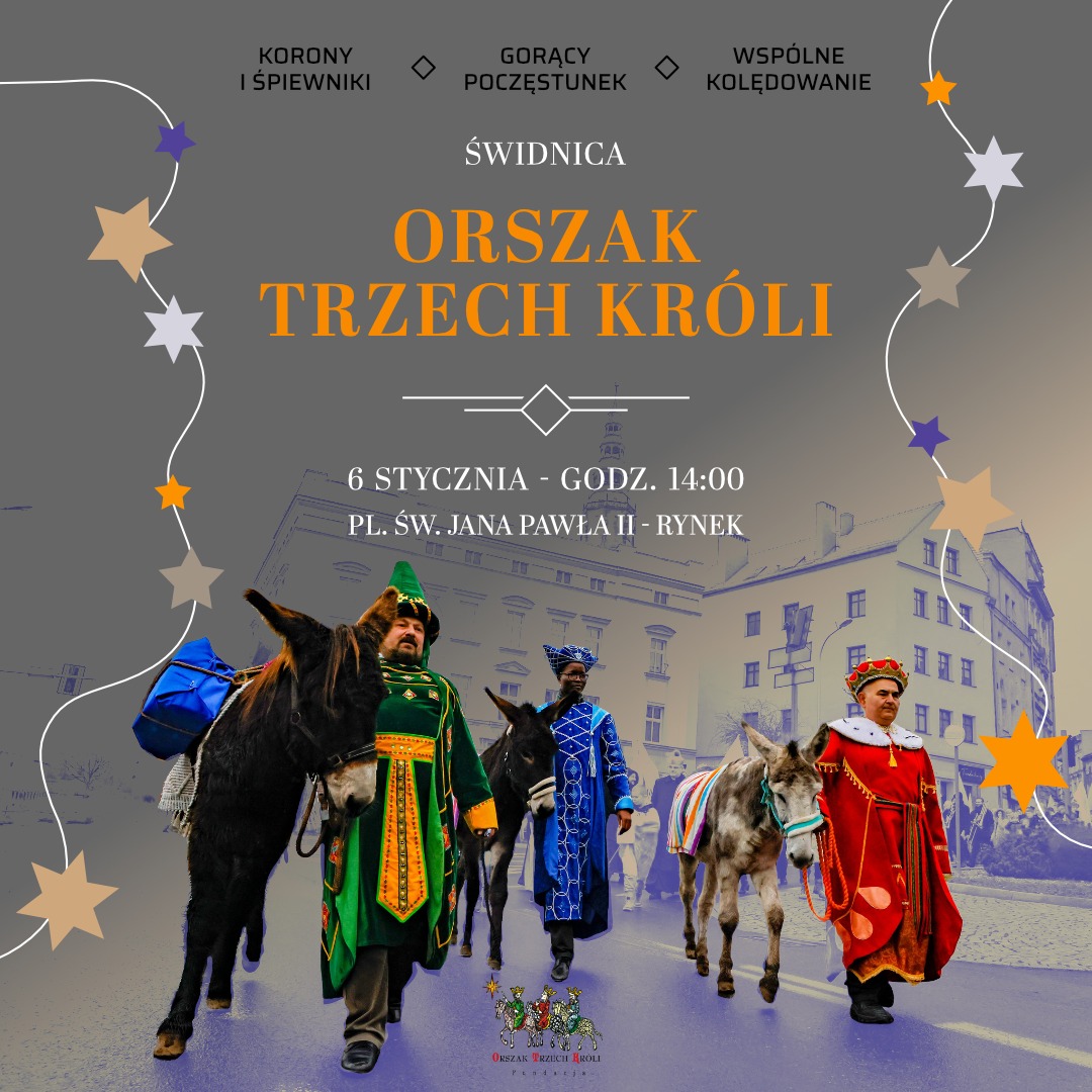 Orszak poprowadzą trzej królowie z osiołkami z Akademii Animaloterapii w Lubachowie. – Przejdziemy do Rynku w rytmie kolęd granych przez orkiestrę dętą z Wałbrzycha i śpiewanych przez Agnieszkę Janus. Po przejściu Orszaku w rynku zapraszamy na ciepły poczęstunek od Caritas Diecezji Świdnickiej oraz wspólne kolędowanie z Zespołem Ludowo-Folkowym „Pszennowskie Trele”! – zapowiada Jaśkowiak. Na uczestników czekać też będą pamiątkowe korony oraz śpiewnik.