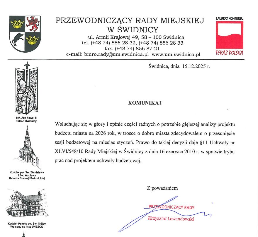 Przewodniczący Rady Miejskiej w Świdnicy potwierdził w komunikacie informacje, którą przekazał w odpowiedzi na pytania Swidnica24.pl 12 grudnia, że sesji budżetowej w grudniu nie będzie. Przesuniecie terminu na styczeń tłumaczy „potrzebą głębszej analizy”, o jaką miał wnioskować część radnych. Co wymaga analizy w projekcie budżetu na 2026 rok, który jest znany radnym od połowy listopada – na to pytanie Krzysztof Lewandowski nie odpowiada, za to pisze z wykrzyknikiem: „Miasto jest w dobrych rękach!”.