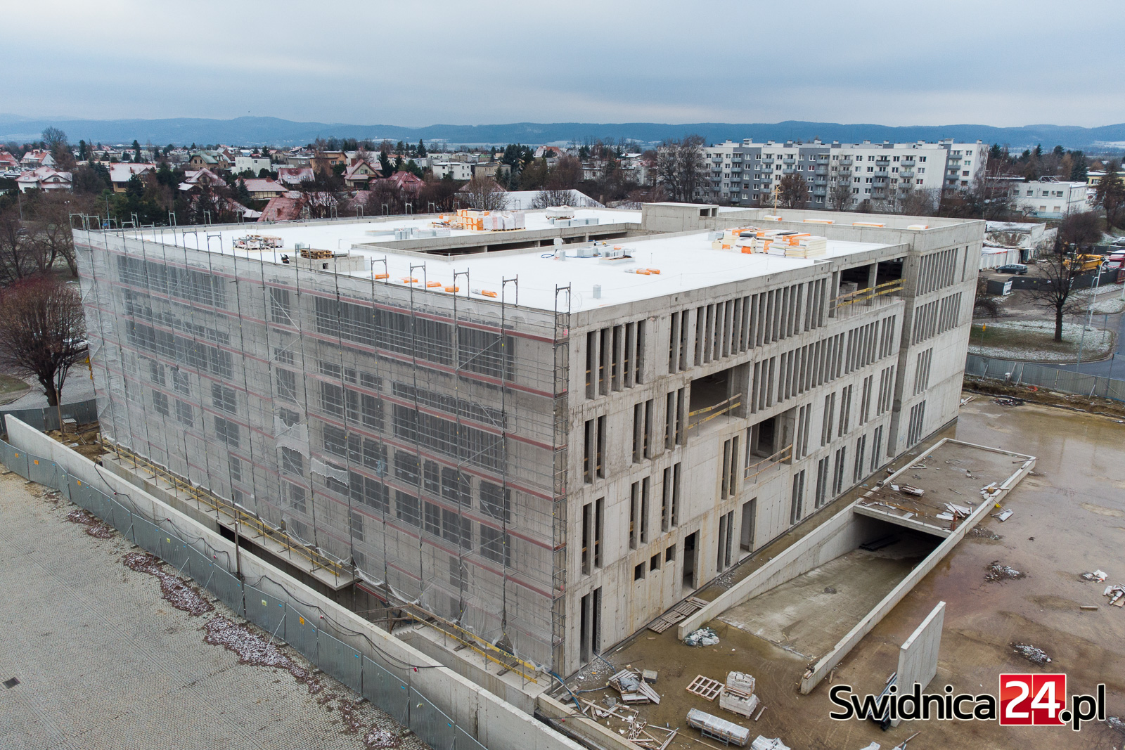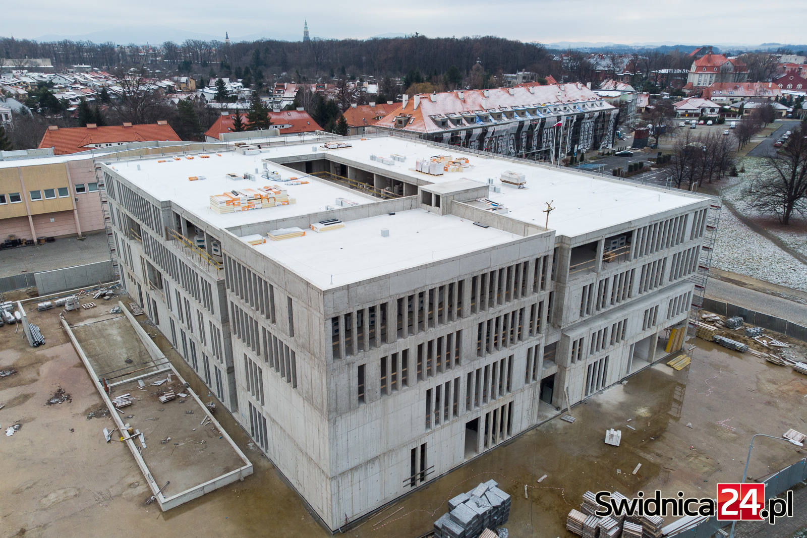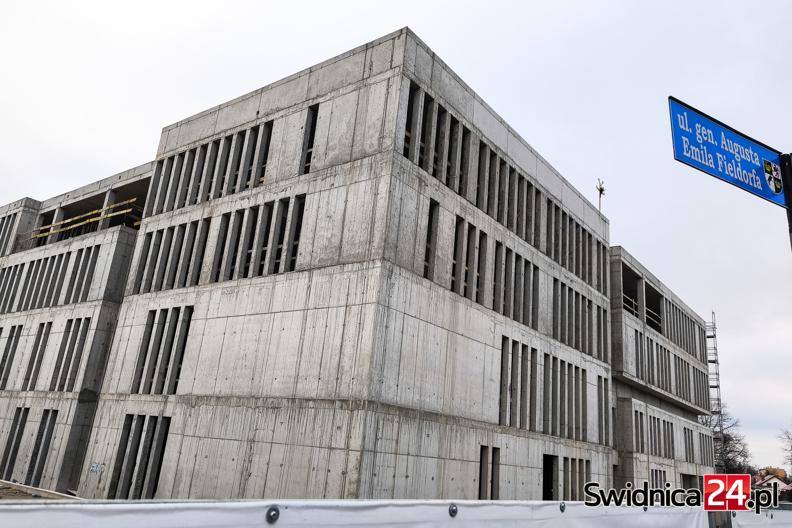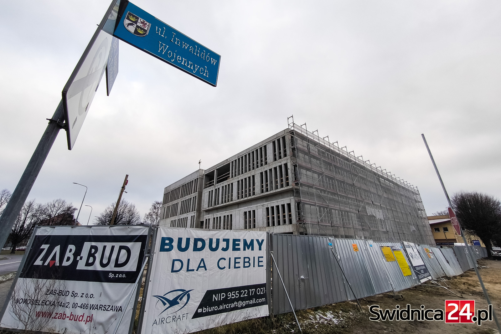 Jeszcze rok temu stały tam garaże, teraz trwa tam budowa nowej siedziby Sądu Rejonowego w Świdnicy. Inwestycja realizowana u zbiegu ulic Inwalidów Wojennych i gen. Augusta Emila Fieldorfa osiągnęła kluczowy etap. Na obiekcie zawisła symboliczna wiecha, co oznacza zakończenie prac konstrukcyjnych.