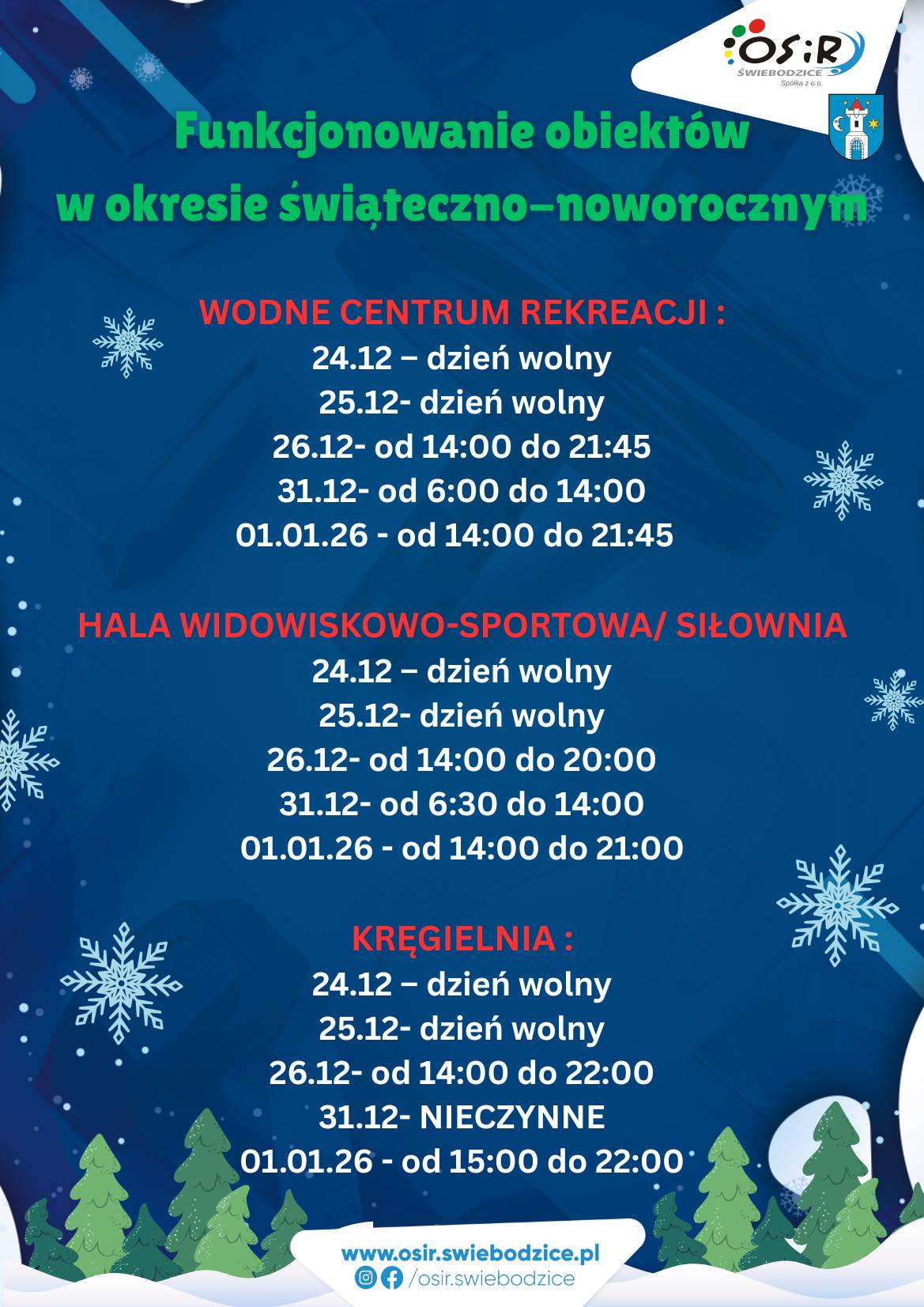 - 25-26.12.2025 (czwartek, piątek – I i II dzień świąt) – pływalnia nieczynna