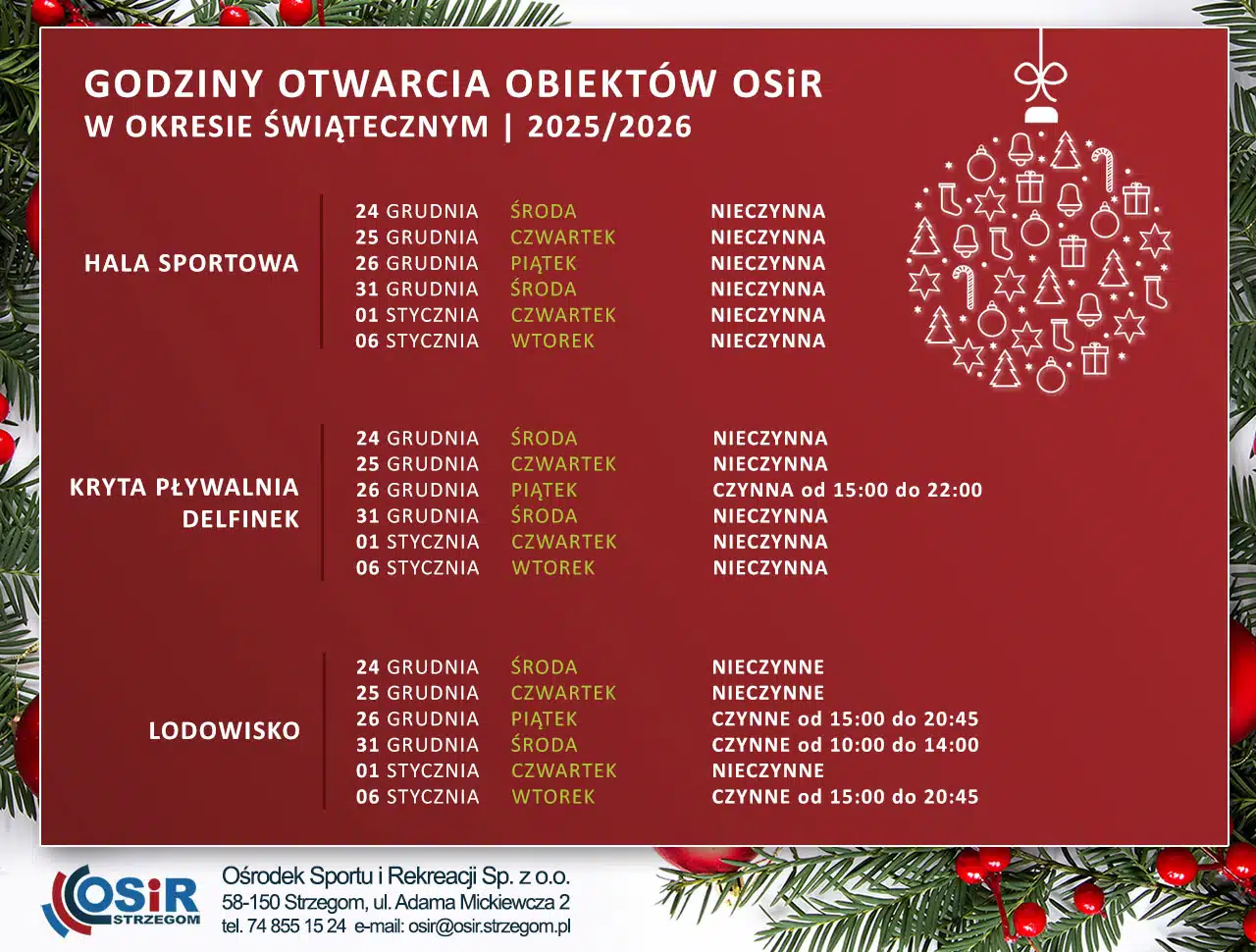 W okresie świątecznym inaczej będzie funkcjonować Centrum Sportowo-Rekreacyjne w Witoszowie Dolnym. – W związku z nadchodzącymi Świętami Bożego Narodzenia, informujemy, że w dniach: 24.12.2025, 25.12.2025, 26.12.2025, 31.12.2025, 01.01.2026, 06.01.2026 basen będzie nieczynny, natomiast w dniach: 23.12.2025, 29.12.2025, 30.12.2025 basen będzie czynny w godzinach 6:00 – 21:45. Sauny działają w godzinach 16:00 – 21:45 – przekazano w komunikacie GOKSiR Świdnica. W przerwie świątecznej nieczynna będzie ścianka wspinaczkowa.