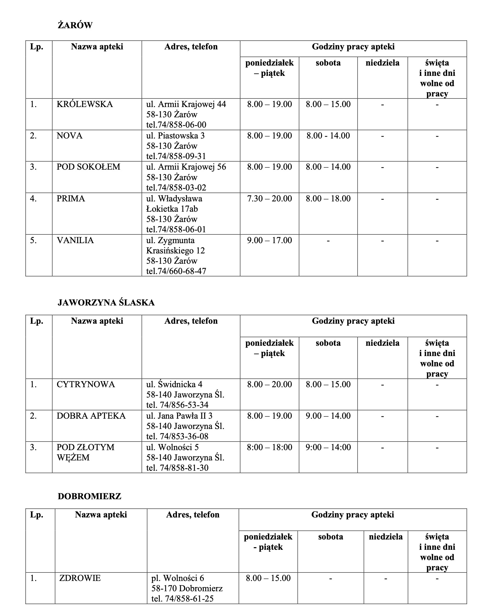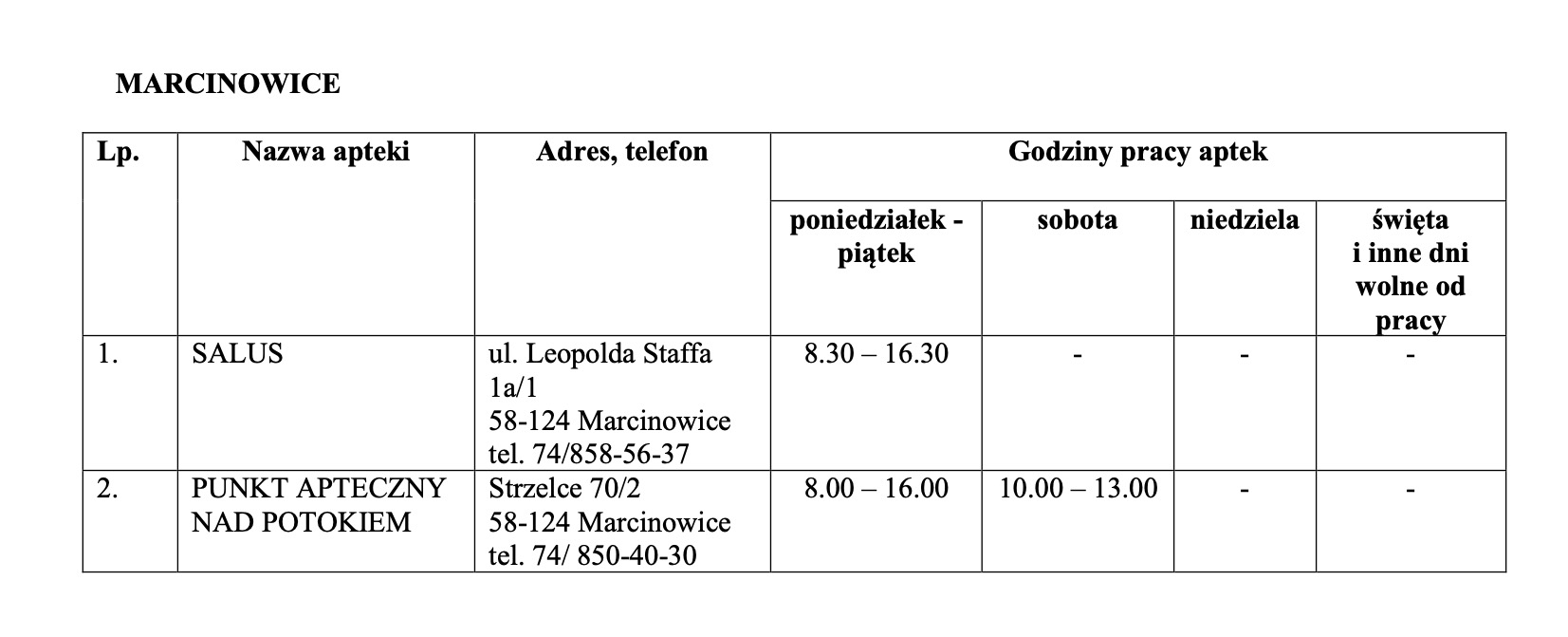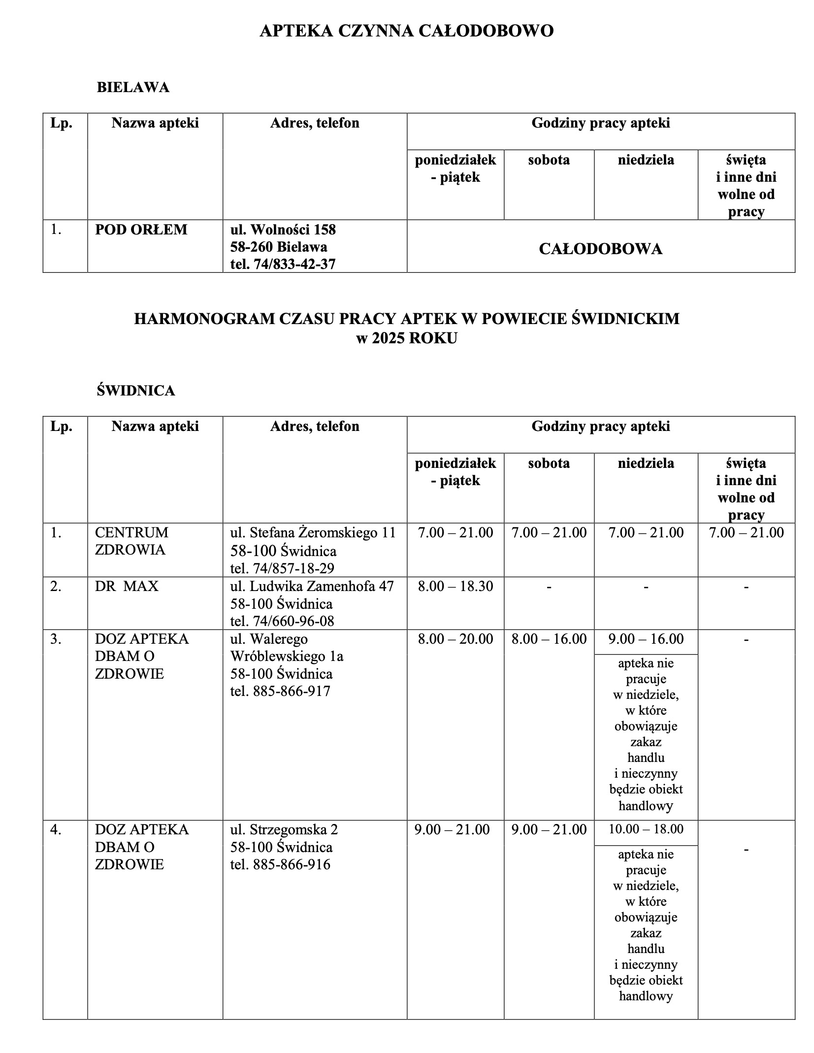 Od 1 stycznia 2024 roku apteki z terenu powiatu świdnicki nie prowadzą dyżurów nocnych. Oto udostępniony przez Starostwo Powiatowe harmonogram pracy aptek (aktualizowany ostatnio w dniu 11 lipca 2025 roku):
