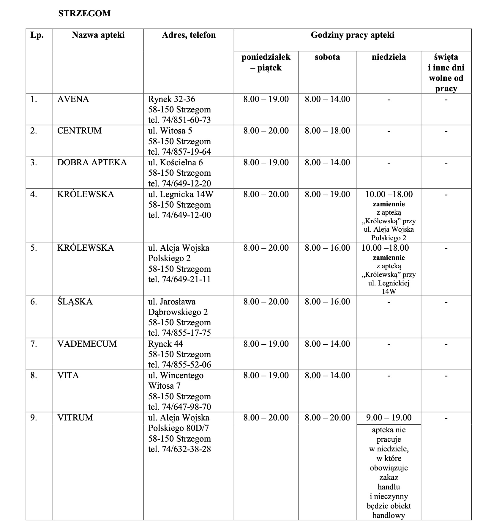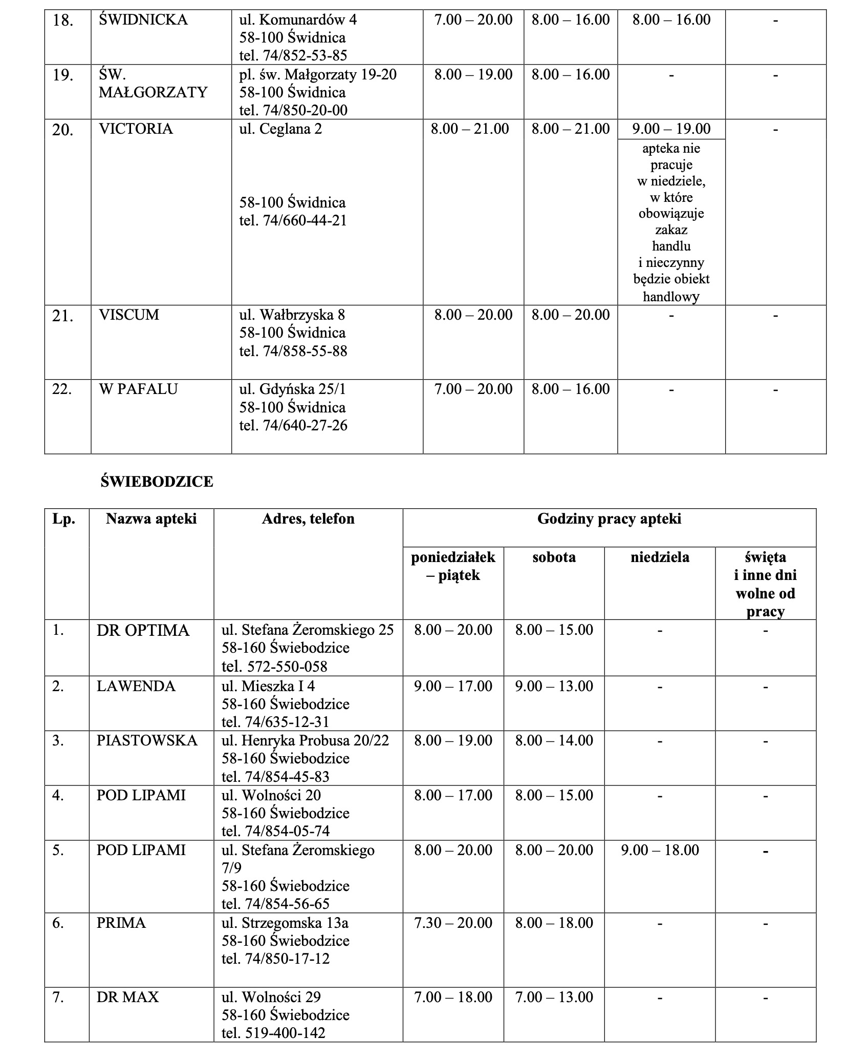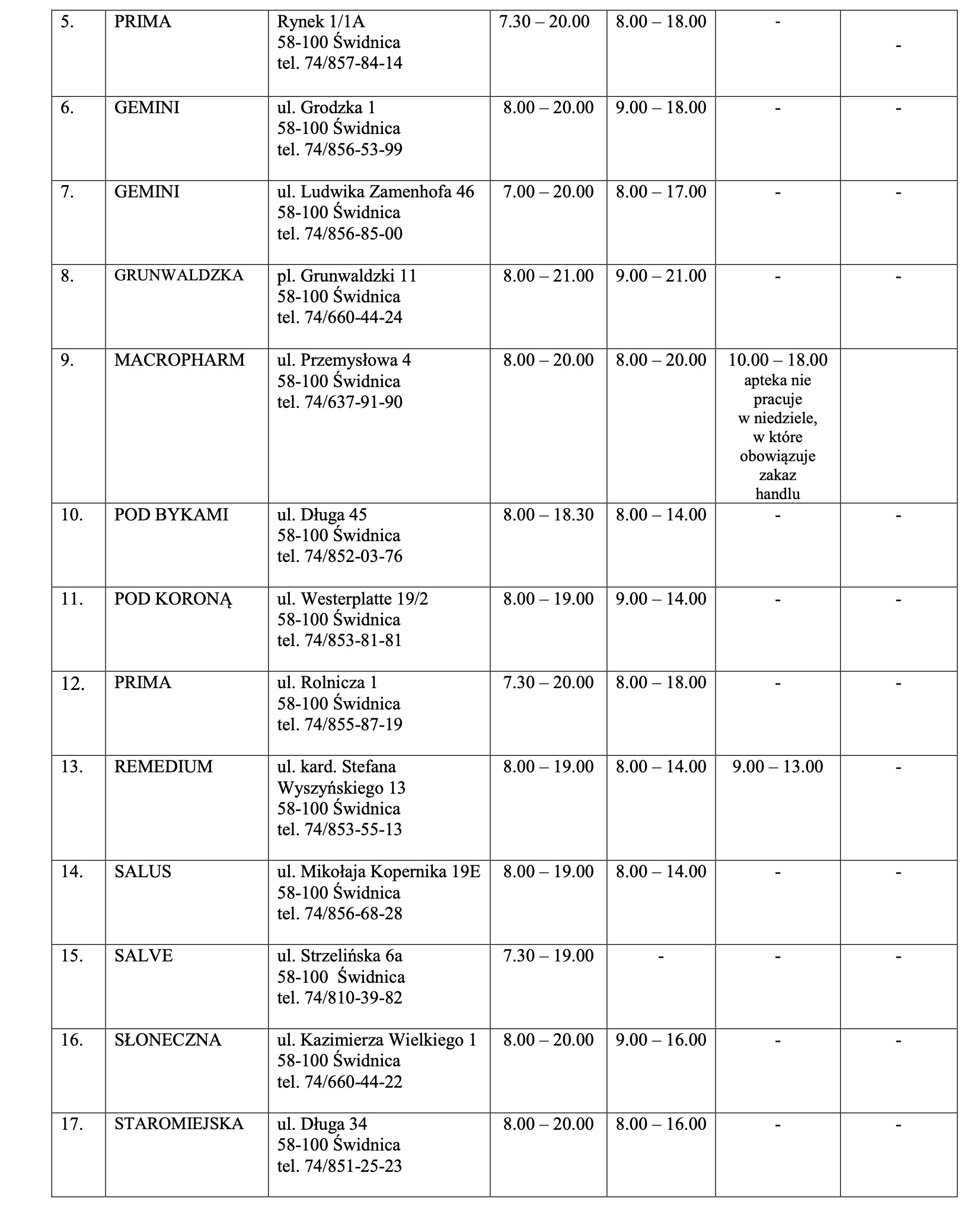 Od 1 stycznia 2024 roku apteki z terenu powiatu świdnicki nie prowadzą dyżurów nocnych. Oto udostępniony przez Starostwo Powiatowe harmonogram pracy aptek (aktualizowany ostatnio w dniu 11 lipca 2025 roku):
