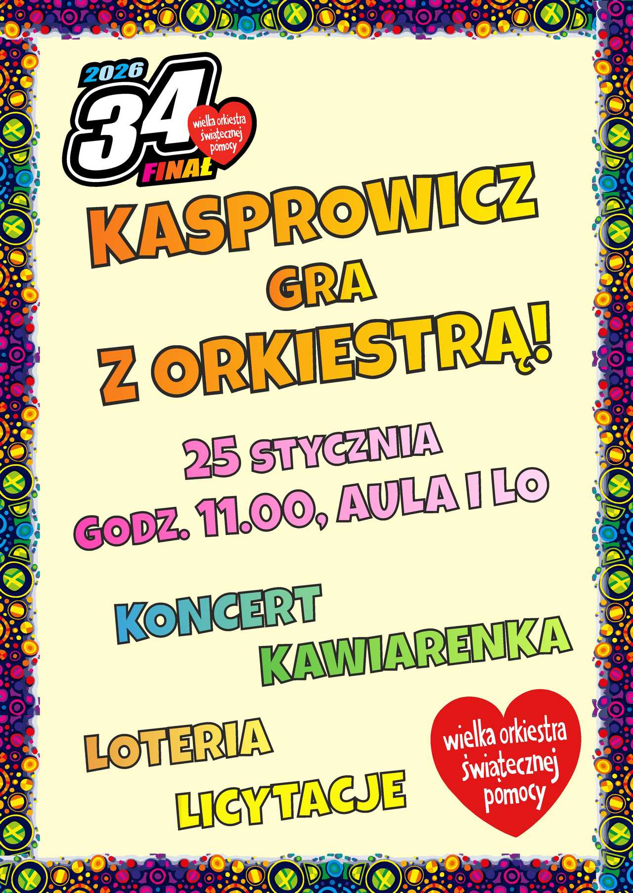 Do orkiestrowej zbiórki kolejny rok z rzędu zaprasza też społeczność I Liceum Ogólnokształcącego im. Kasprowicza w Świdnicy. W dniu 34. Finału Wielkiej Orkiestry Świątecznej Pomocy w auli szkoły przy ulicy Pionierów Ziemi Świdnickiej odbędzie się koncert „Kasprowicz gra z Orkiestrą”. Początek o godzinie 11.00.