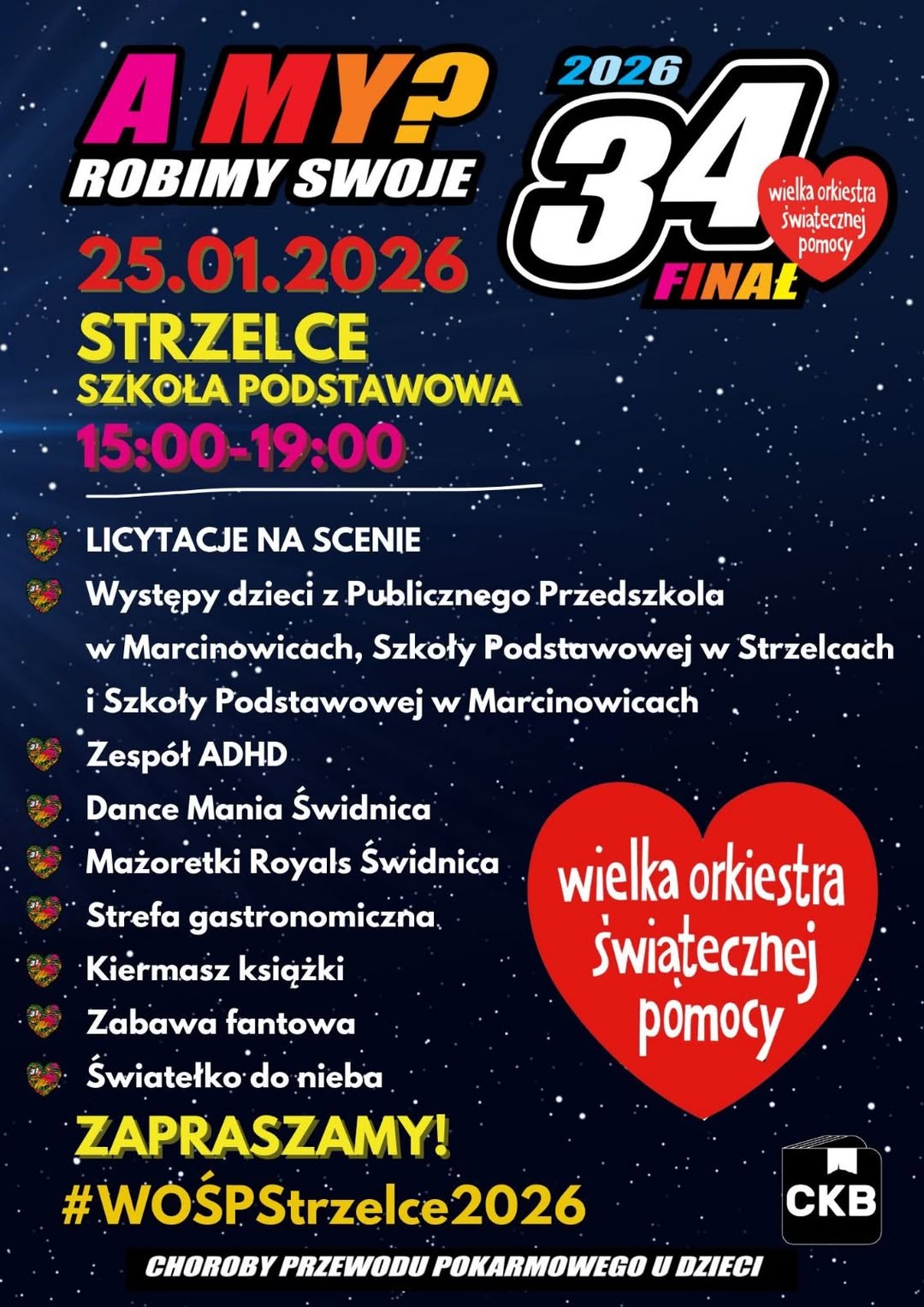 Moc atrakcji szykuje też marcinowicka sekcja połączonego sztabu, która zaprasza do Szkoły Podstawowej w Strzelcach, gdzie – jak przekonują organizatorzy – od godziny 15.00 będzie głośno, słodko i na bogato. Wydarzenie potrwa do godziny 19.00. W programie znalazły się: licytacje, występy dzieci z Publicznego Przedszkola w Marcinowicach, Szkoły Podstawowej im. K. K. Baczyńskiego w Strzelcach, Szkoły Podstawowej im. Lotników Polskich w Marcinowicach, występ zespołu ADHD, Szkoły Tańca Dance Mania, Mażoretek Royals Świdnica. Na gości czekać też będzie strefa gastronomiczna, kiermasz książki, zabawa fantowa oraz światełko do nieba.