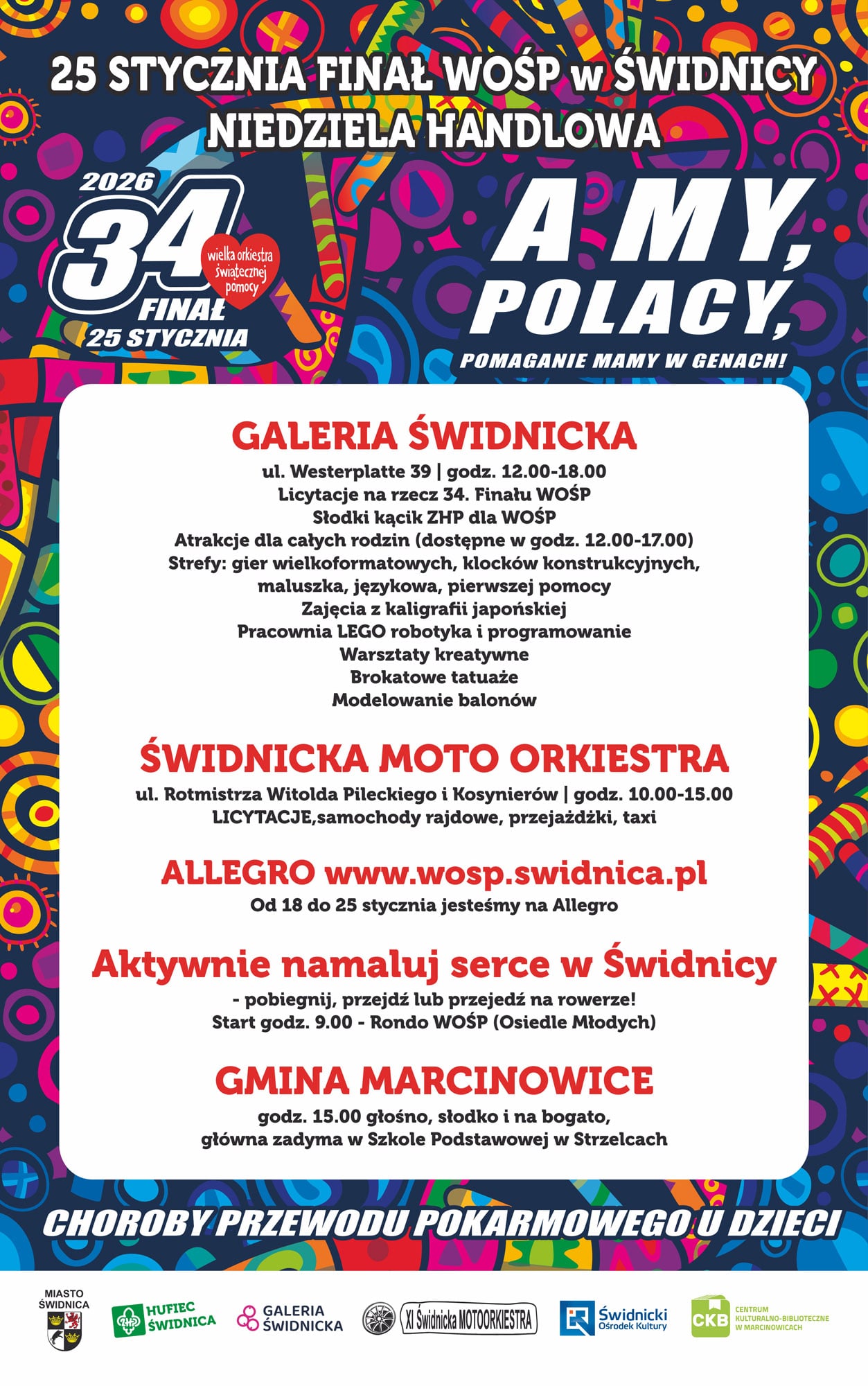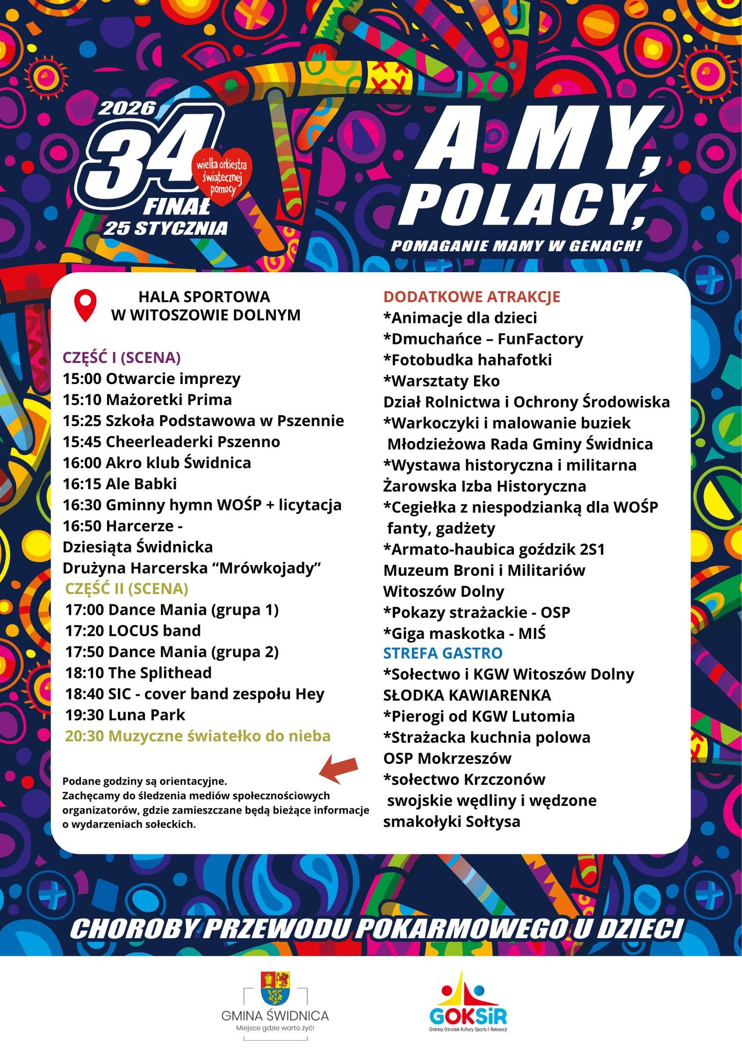 34. Finał Wielkiej Orkiestry Świątecznej Pomocy w tym roku w Świebodzicach zapowiada się wyjątkowo atrakcyjnie. Organizatorzy przygotowali bogaty program wydarzeń rozlokowanych w trzech kluczowych punktach miasta: hali OSiR-u, Liceum Ogólnokształcącym im. Marii Konopnickiej oraz w siedzibie Polskiego Związku Emerytów i Rencistów.