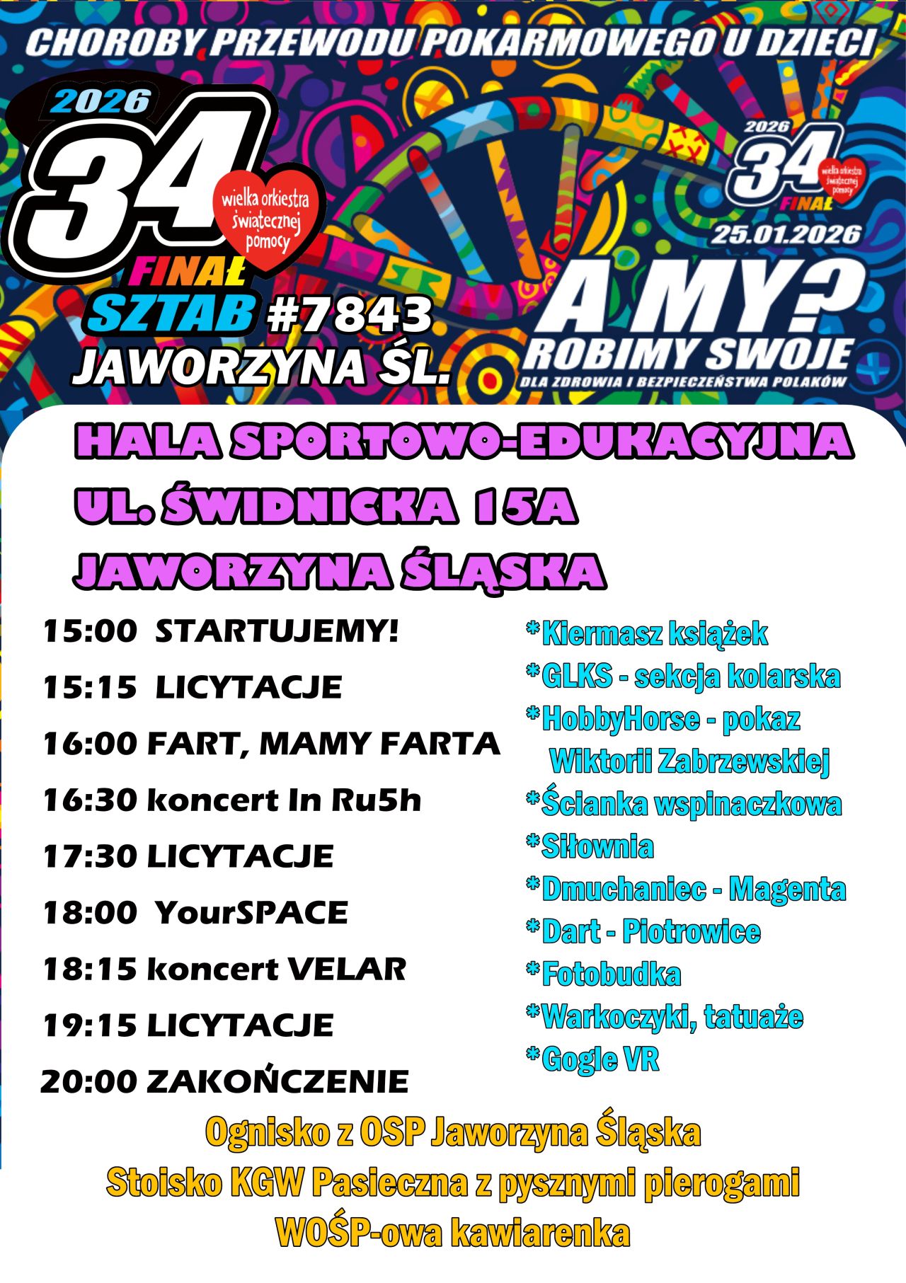 Kulminacją niedzielnej kwesty będzie impreza finałowa, na którą wolontariusze zapraszają do hali sportowo‑edukacyjnej w Jaworzynie Śląskiej. Od godziny 15.00 startuje program występów artystycznych, licytacji i mnóstwa atrakcji dla dzieci i dorosłych. Na WOŚP-owej scenie wystąpią zespoły „In Ru5h” i „Velar”, a radosną atmosferę podtrzymają prezentacje grup tanecznych „Your Space” oraz zespołów tanecznych „Fart” i „Mamy Farta”. Nie zabraknie emocjonujących licytacji, podczas których będzie można zdobyć unikalne gadżety, takie jak sztabowa koszulka lub oryginalny kubek WOŚP, a także vouchery na usługi do lokalnych salonów oraz znanych i lubianych miejsc w okolicy.