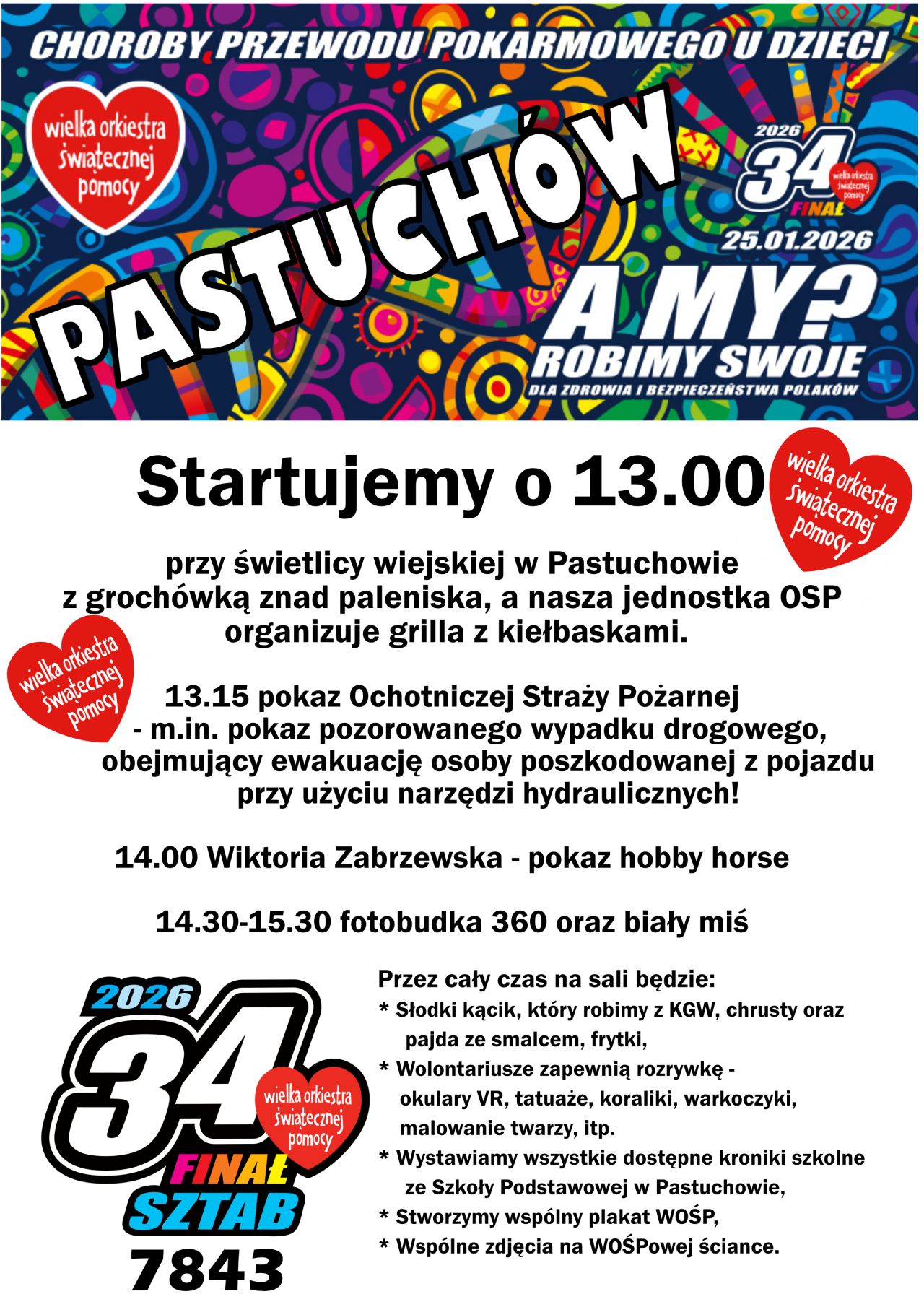 Atrakcjom i pokazom będą towarzyszyć: słodki kącik przygotowany przez panie z KGW „Fit Babki”, stoisko gastronomiczne (pajda ze smalcem, frytki), animacje wolontariuszy: gogle VR, tatuaże, koraliki, warkoczyki, malowanie twarzy, tworzenie wspólnego plakatu WOŚP. Przez cały czas trwania imprezy dla odwiedzających świetlicę wiejską dostępna będzie również wystawa kronik Szkoły Podstawowej w Pastuchowie oraz specjalna WOŚP-owa fotościanka do pamiątkowych zdjęć.