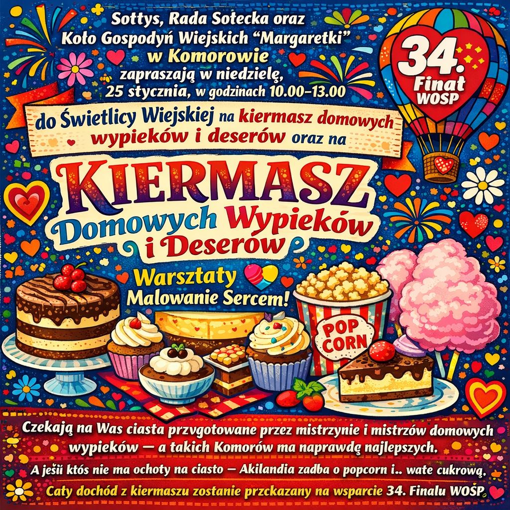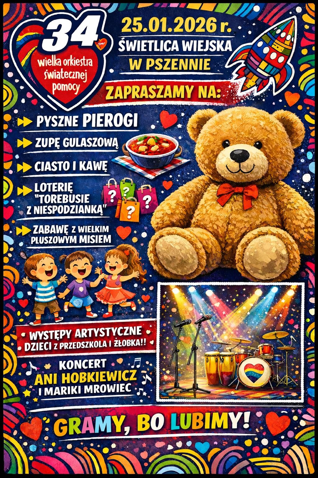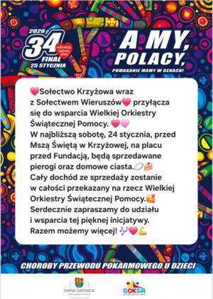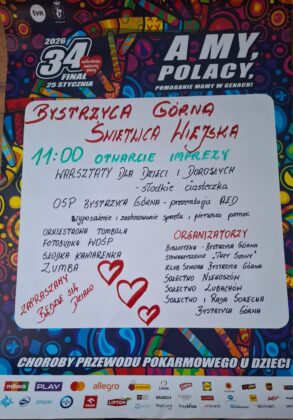 – Nie tylko scena! Przez cały dzień dostępne będą m.in.: animacje dla dzieci, dmuchańce, fotobudka, warsztaty ekologiczne, warkoczyki i malowanie buziek, wystawy historyczne i militarne, pokazy strażackie OSP, giga maskotka MIŚ, stoiska z fantami i gadżetami WOŚP – wyliczają przedstawiciele sztabu. Podczas gminnego Finału nie zabraknie strefy gastronomicznej z pysznościami od lokalnych Kół Gospodyń Wiejskich, sołectw i strażaków.